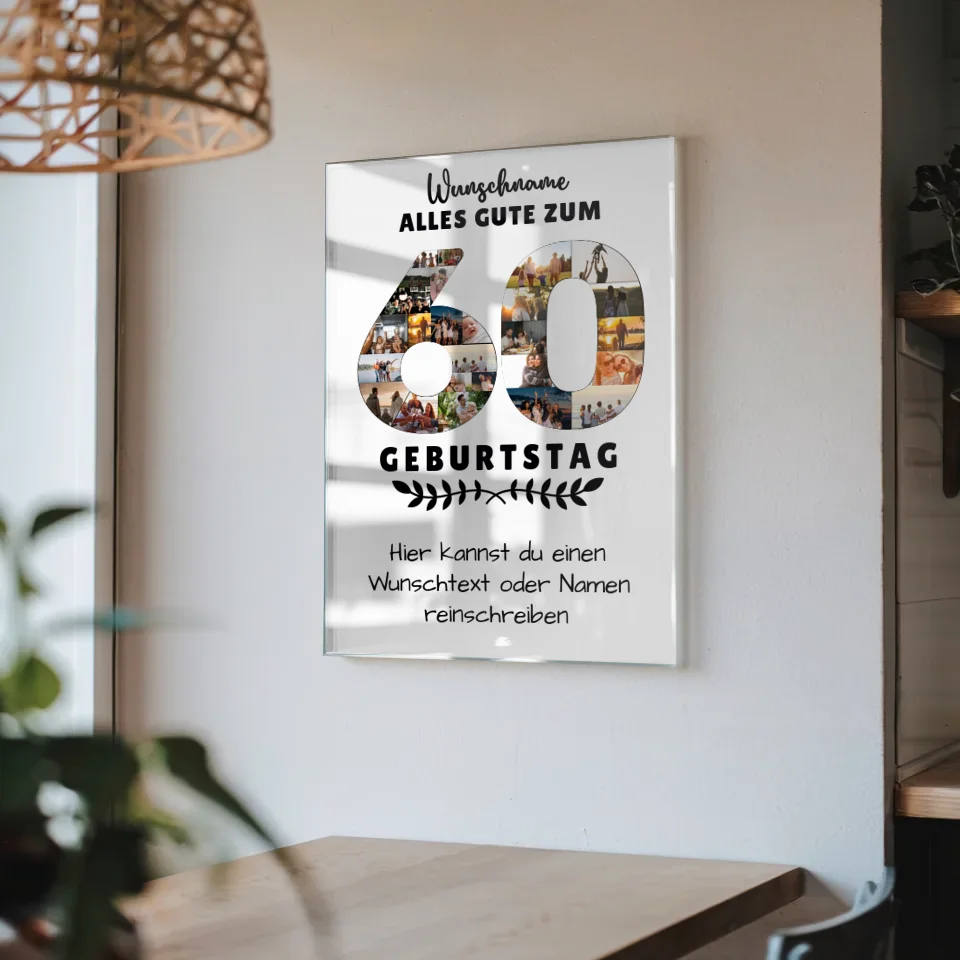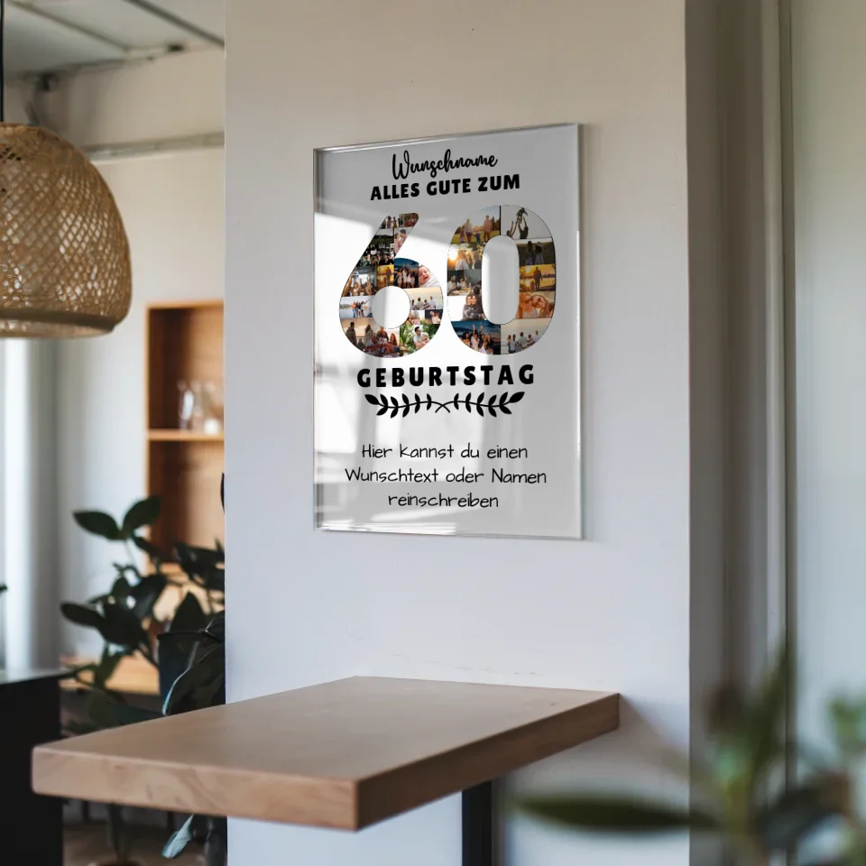 Du suchst nach einem ganz besonderen Geschenk zum 60. Geburtstag? Unser personalisiertes Acrylglas Bild ist die ideale Wahl! Dieses einzigartige Geschenk ermöglicht es dir, über 20+ Fotos sowie deinen persönlichen Wunschtext oder Spruch und den Namen des Geburtstagskindes, sei es Mama oder Papa, zu integrieren. So wird das Acrylglas Bild zu einem individuellen Erinnerungsstück, das die schönsten Momente feiert.