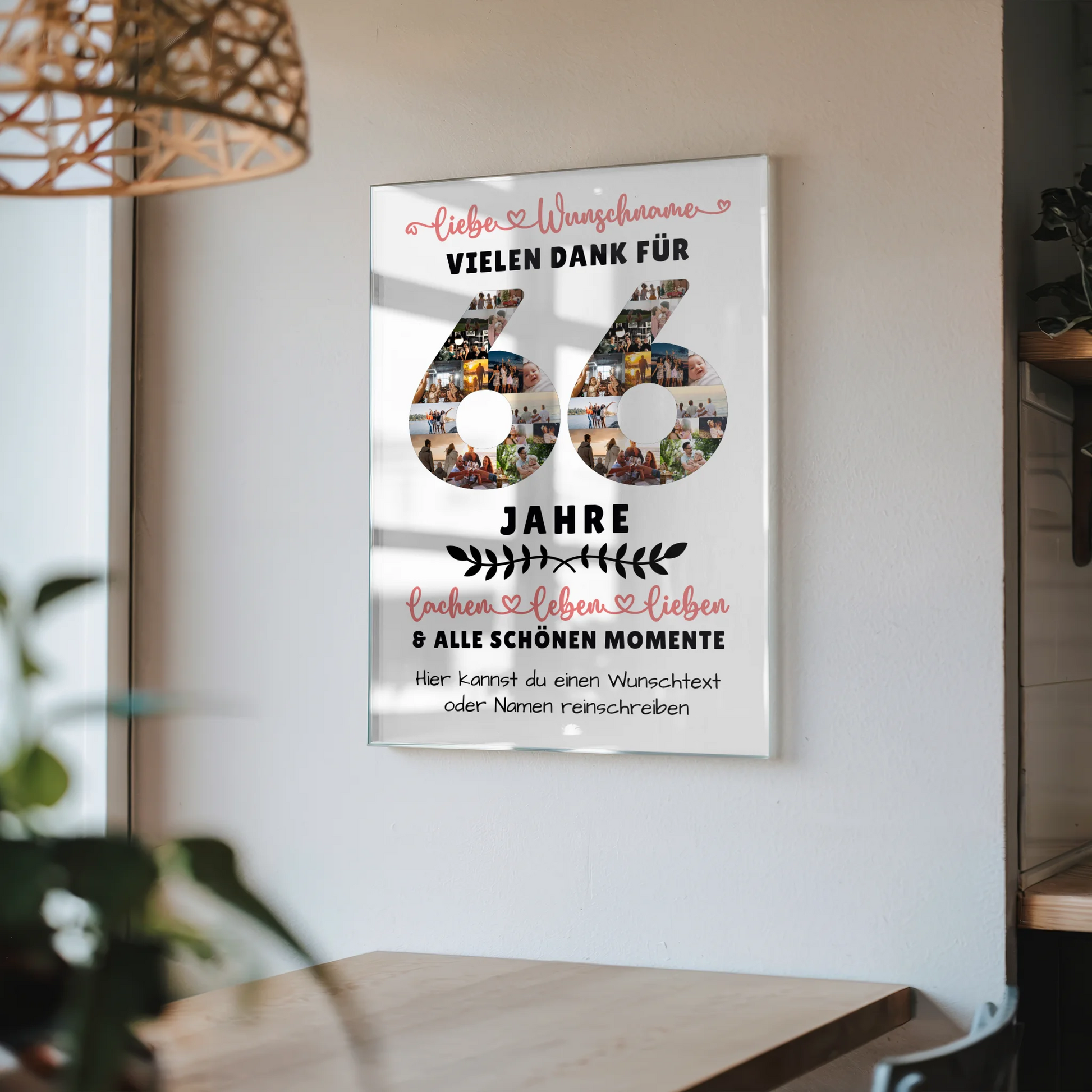 Überrasche deine Liebsten mit einem einzigartigen und persönlichen Geschenk zum 66 Geburtstag – unserem personalisierten Acrylglas Bild. Dieses besondere Geschenk ist perfekt für Mama, Papa, Schwester, Bruder, Sohn, Tochter, beste Freundin, Neffe, Nichte, Oma, Opa oder Tante. Gestalte dein individuelles Personalisiertes Acrylglas Bild, das mit über 20+ Fotos, Namen, Wunschtext und Hintergrundbild ganz nach deinen Wünschen gestaltet werden kann. Es ist eine wunderschöne Erinnerung und ein Blickfang in jedem Zuhause. Das personalisierte Acrylglas Bild eignet sich ideal als Geschenk zum 66 Geburtstag und zeigt deine Wertschätzung auf eine kreative und emotionale Weise. Ob für die Familie oder enge Freunde – dieses Geschenk wird garantiert für Freude sorgen. Du kannst das Design ganz individuell anpassen und so ein einzigartiges Präsent kreieren, das den besonderen Anlass unvergesslich macht. Überrasche deine Liebsten mit einem stilvollen Personalisiertes Acrylglas Bild, das sie noch lange schätzen werden.
