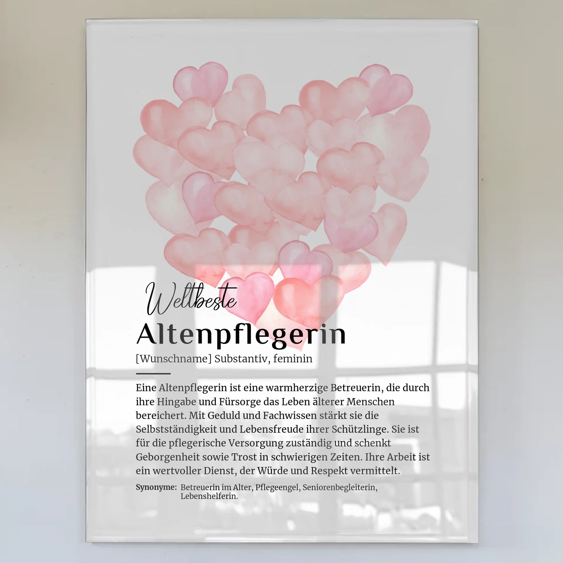 Suchst du nach einer einzigartigen Geschenkidee für eine besondere Altenpflegerin in deinem Leben? Dann ist unser personalisiertes Acrylglas Bild Altenpflegerin mit Namen die ideale Wahl! Dieses individuelle Kunstwerk bringt nicht nur Freude, sondern zeigt auch Wertschätzung für die harte Arbeit und den Einsatz von Altenpflegerinnen und Altenpflegern.