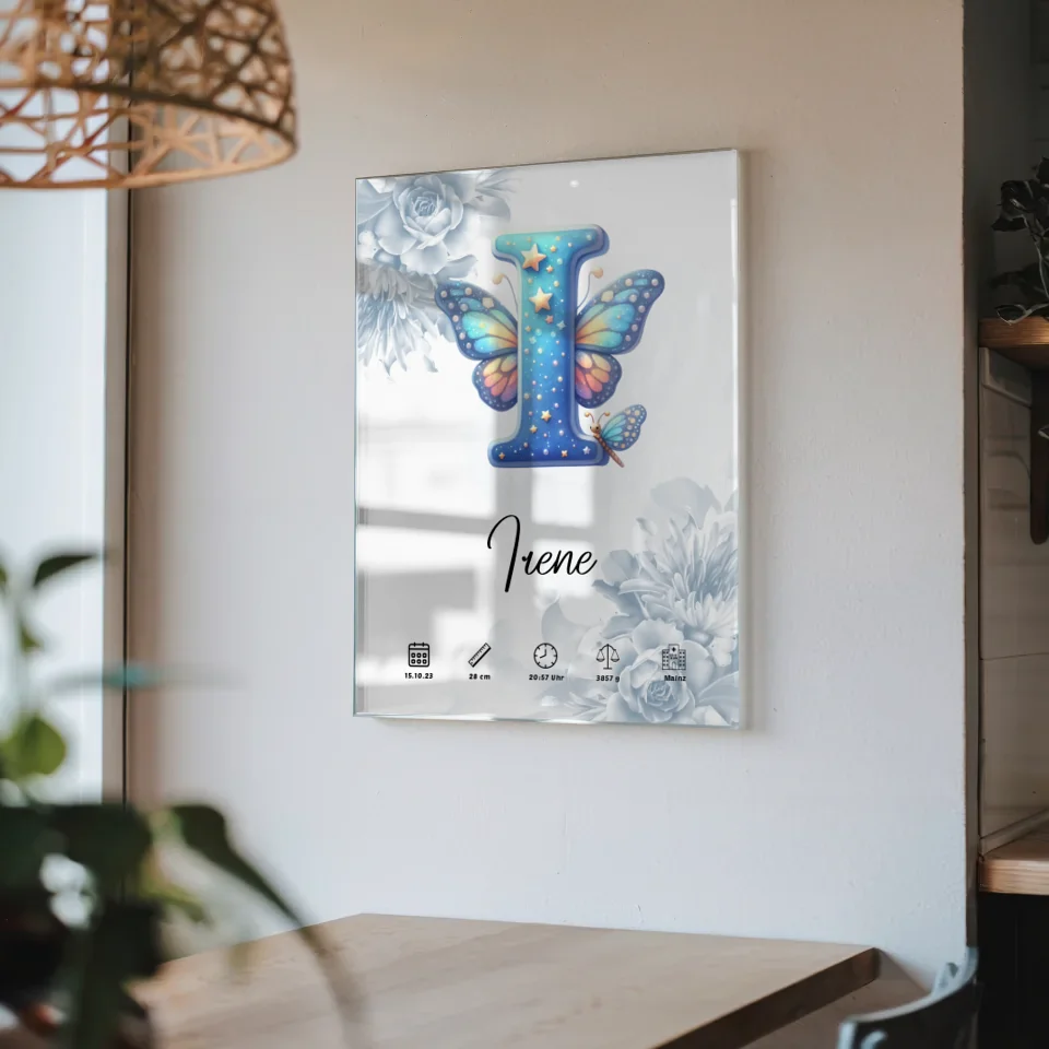 Personalisiertes Acrylglas Bild Anfangsbuchstaben I Blüten Blau Geburt