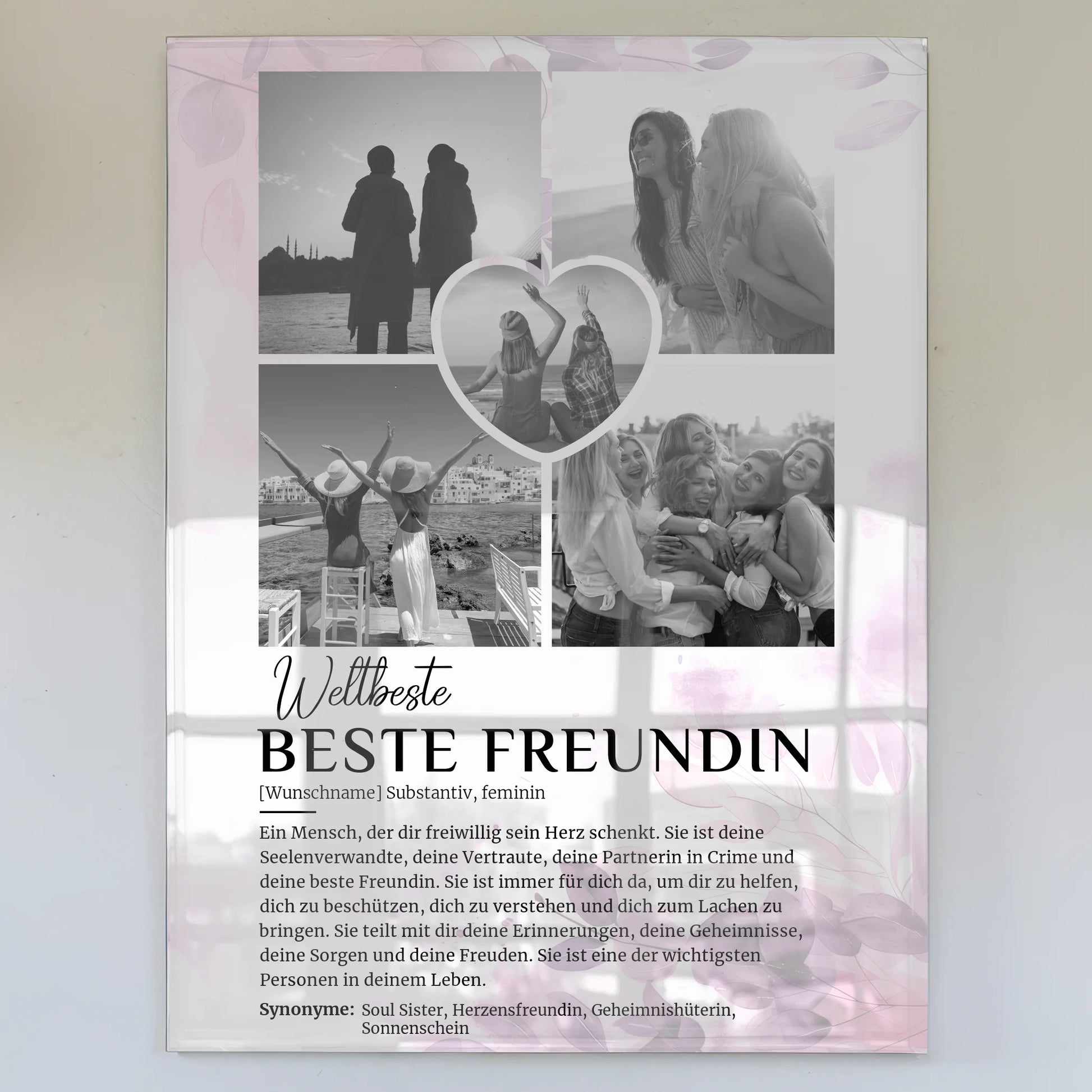Nutze die Gelegenheit, eine besondere Freundin mit einem personalisierten Geschenk zu überraschen, das ihre Bedeutung in deinem Leben unterstreicht. Gönn dir das personalisierte Acrylglas Bild Beste Freundin 5 Fotos Schwarz Weiß und schaffe einen einzigartigen Moment, der für immer bleibt. Egal ob als persönliche Erinnerung oder stilvolles Wohnaccessoire - dieses Acrylglas Bild wird garantiert für Freude sorgen!
