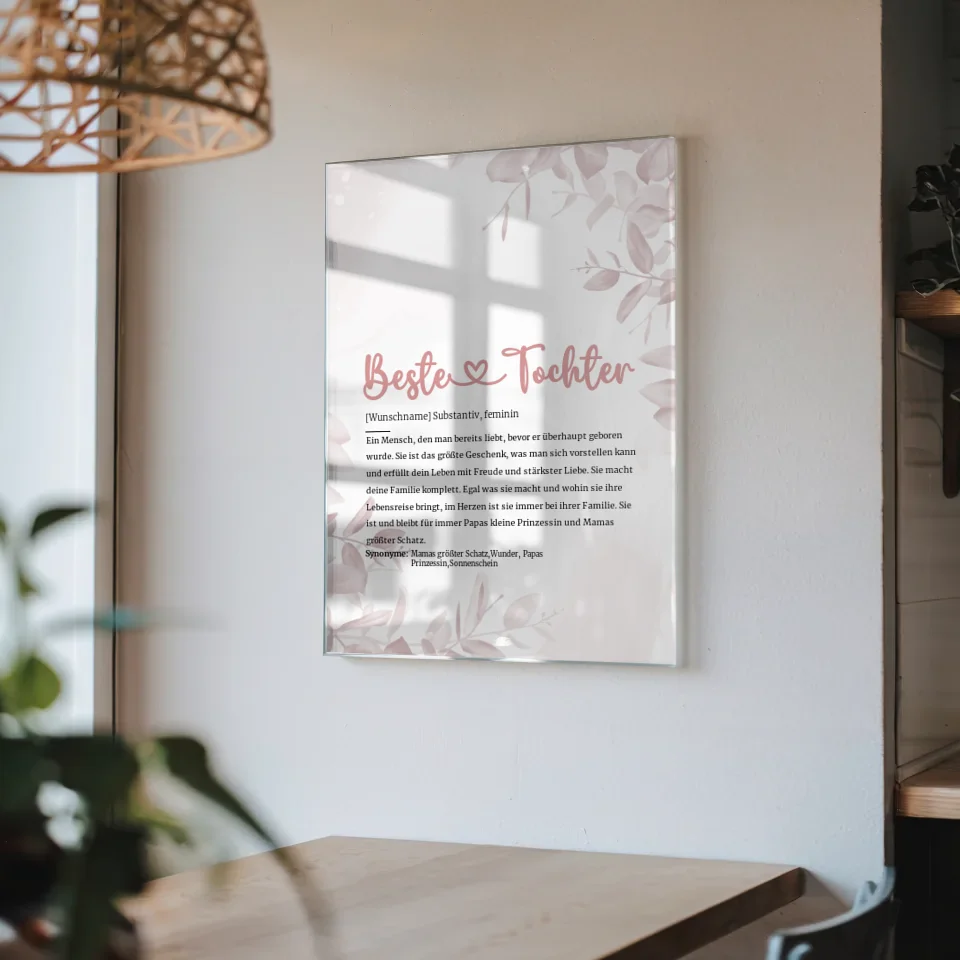 Verschenke emotionale Erinnerungen in Form eines personalisierten Acrylglas Bildes, das die Definition der besten Tochter mit ihrem Namen vereint. Dieses Geschenk wird nicht nur ein wundervolles Dekorationselement, sondern auch ein liebevolles Andenken, das sie für immer schätzen wird!