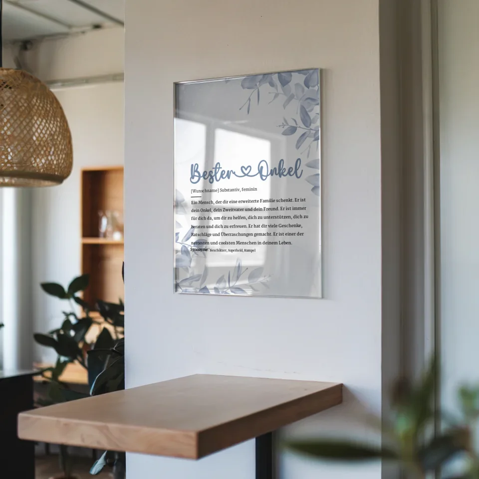 Mit seinem eleganten Design und der besonderen Botschaft „Definition Bester Onkel“ wird dieses Acrylglas Bild garantiert zum Blickfang in jedem Zuhause. Lass deiner Kreativität freien Lauf und kreiere ein einzigartiges Geschenk, das von Herzen kommt. Mach jetzt deinem Onkel eine besondere Freude mit unserem personalisierten Acrylglas Bild! Bestelle noch heute und überrasche ihn mit einem Geschenk, das ihn zum Schmunzeln bringt!