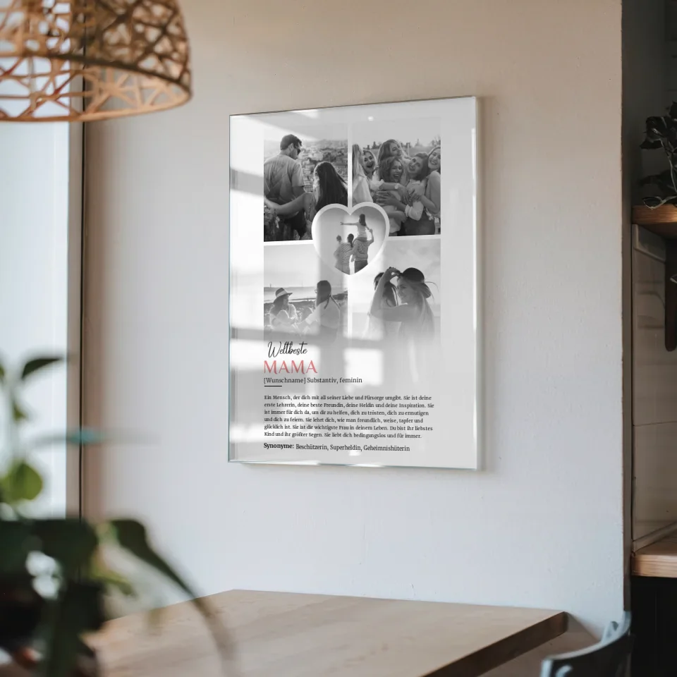 Mit unserem Acrylglas Bild bringst du die Definition von Mama zum Ausdruck. Es ist mehr als nur ein Geschenk – es ist ein Zeichen der Wertschätzung und Liebe. Überrasche deine Mama mit einem individuell gestalteten Kunstwerk, das direkt von Herzen kommt. Jetzt ist der perfekte Moment, um ein außergewöhnliches Präsent zu gestalten, das für immer in Erinnerung bleibt. Gestalte noch heute dein personalisiertes Acrylglas Bild und zeige deiner Mama, wie viel sie dir bedeutet!