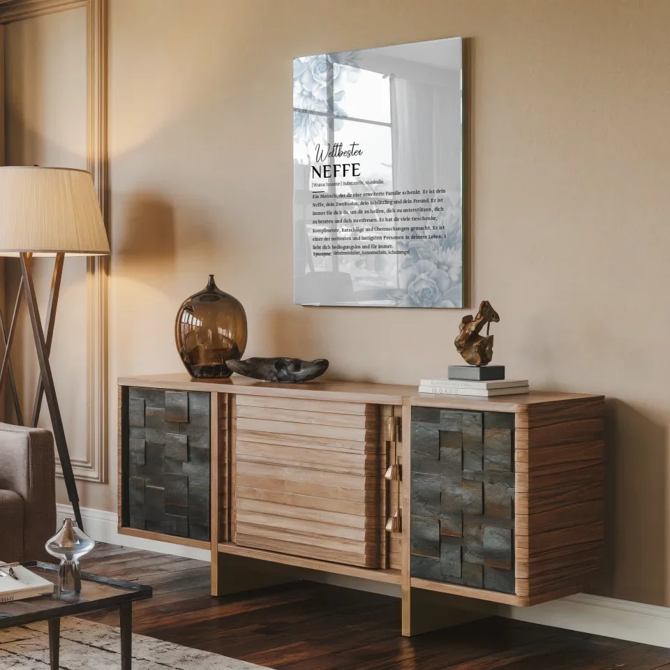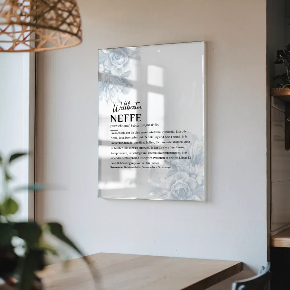 Setze ein Statement mit dem personalisierten Acrylglas Bild Definition Neffe Eukalyptus Stil mit Name und mache jeden Anlass unvergesslich!
