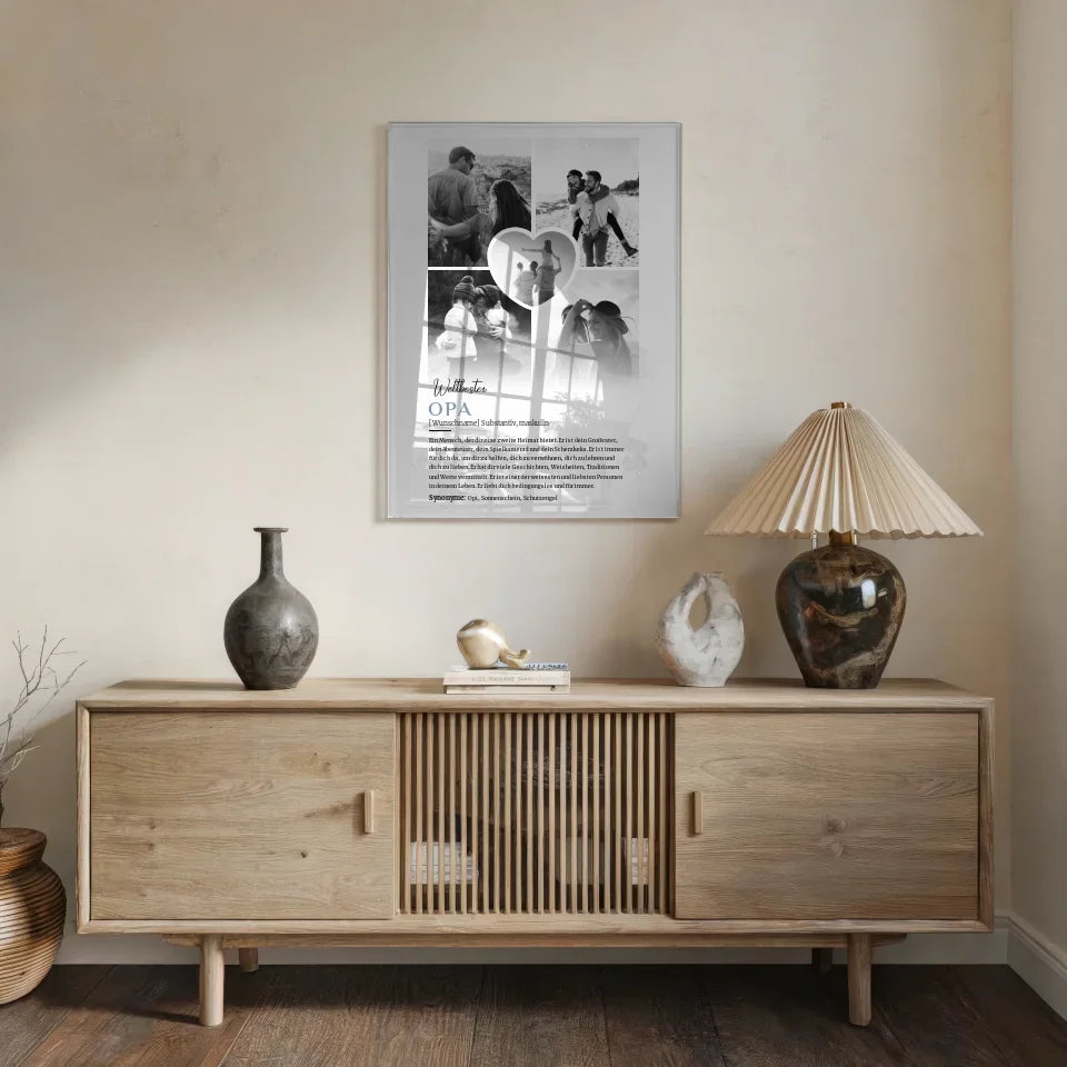 Überrasche deinen Opa mit einem einzigartigen und stilvollen Geschenk! Das personalisierte Acrylglas Bild "Definition Opa" ist nicht nur ein echter Hingucker, sondern auch ein emotionales Andenken. Du kannst dieses individuelle Kunstwerk mit 5 Fotos & Name gestalten, wodurch es zu einem ganz besonderen Erinnerungsstück wird.