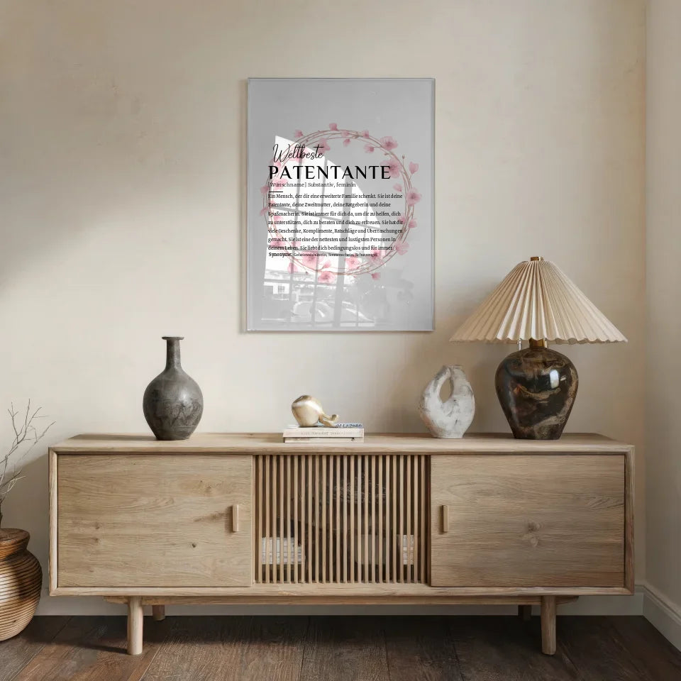 Überrasche deine Patentante mit einem einzigartigen und personalisierten Geschenk! Unser personalisiertes Acrylglas Bild Definition Patentante mit Name Blütenkranz ist die perfekte Wahl für besondere Anlässe wie Geburtstage oder Weihnachten. Dieses stilvolle Acrylglas Bild bringt nicht nur Farbe in jeden Raum, sondern zeigt auch die besondere Bedeutung deiner Patentante in deinem Leben. Mit der Möglichkeit, den Namen deiner Patentante einzufügen, wird dieses Geschenk zu einem ganz persönlichen Highlight. Der hübsche Blütenkranz umrahmt die liebevolle Definition und macht das Bild zu einem echten Kunstwerk. Beschenke deine Patentante mit einem emotionalen und kreativen Geschenk, das sie immer schätzen wird. Ein personalisiertes Acrylglas Bild ist nicht nur dekorativ, sondern auch eine wunderbare Erinnerung an besondere Momente. Bestelle jetzt dein personalisiertes Acrylglas Bild und mache deiner Patentante eine Freude, die bleibt!