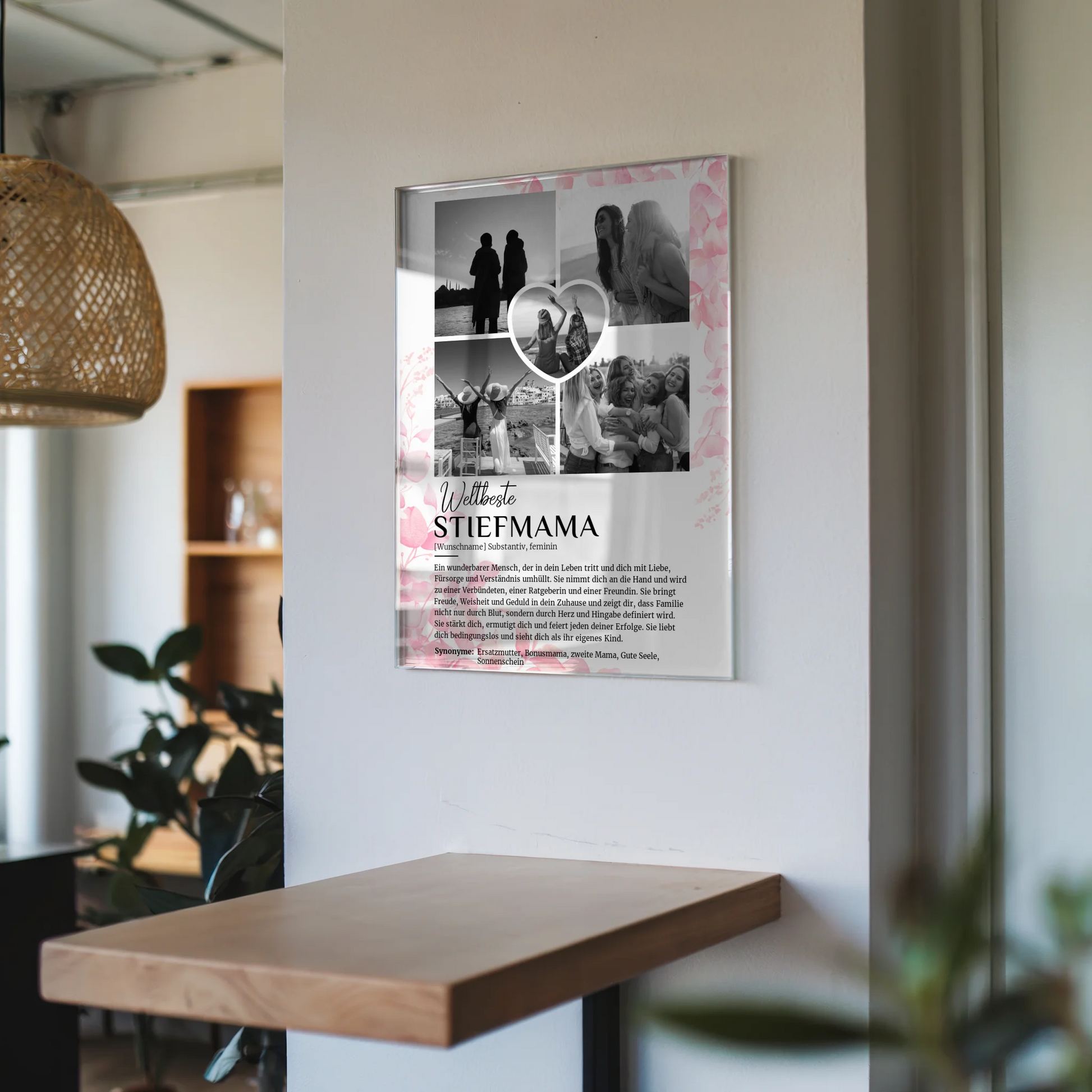 Verpasse nicht die Gelegenheit, deiner Stiefmama eine Freude zu machen! Bestelle jetzt das personalisiert Acrylglas Bild Definition Stiefmama mit 5 Fotos und mache ihr ein unvergessliches Geschenk, das von Herzen kommt.