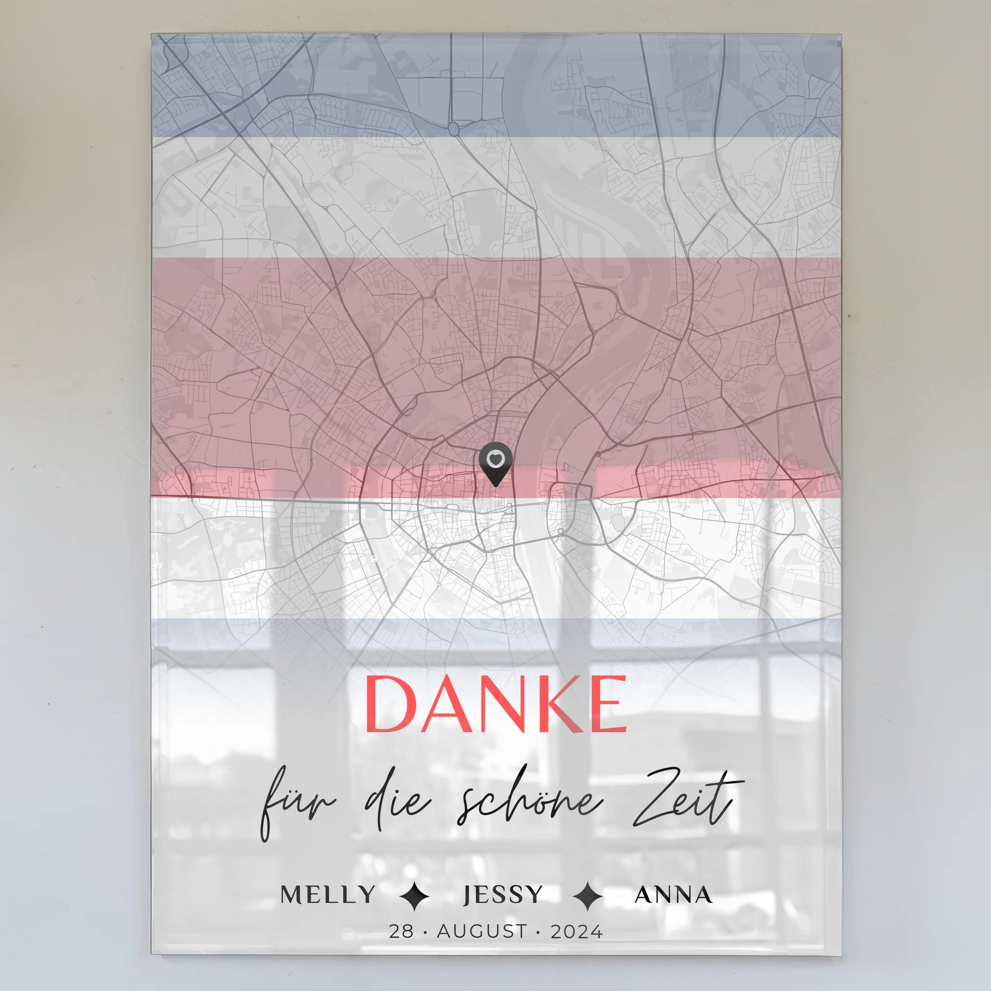 Das Design ermöglicht es dir, bis zu 5 Namen deiner Freundinnen zu integrieren und einen besonderen Ort auf der Karte zu markieren, der für euch eine wichtige Bedeutung hat. Zusätzlich kannst du einen persönlichen Spruch oder Wunschtext hinzufügen – zum Beispiel den schönen Spruch 'Danke Für Die Schöne Zeit', der eure gemeinsame Zeit wunderbar widerspiegelt. So wird dein Acrylglas Bild nicht nur zu einem tollen Kunstwerk, sondern auch zu einem unvergesslichen Geschenk mit emotionalem Wert.