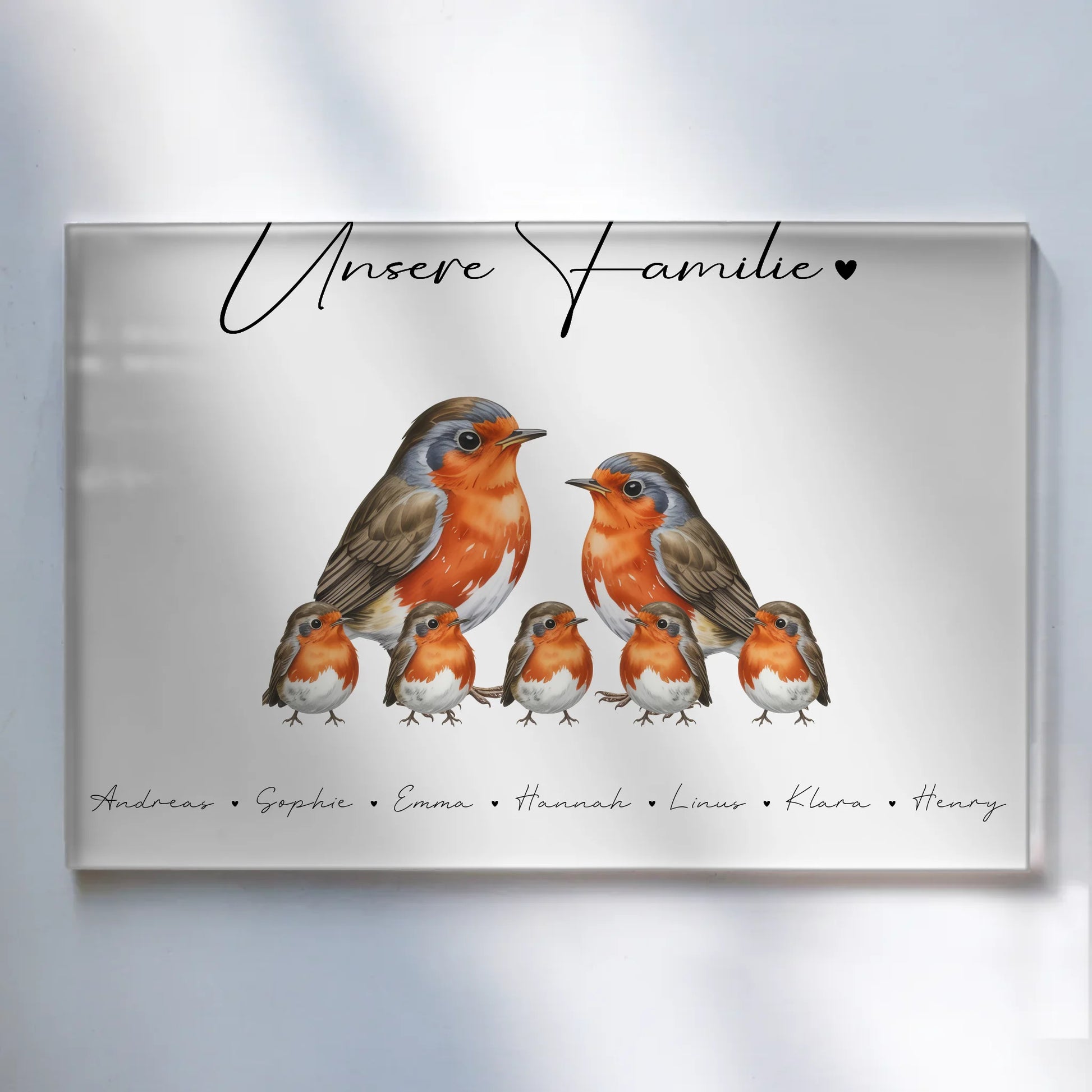 Personalisiertes Acrylglas Bild magnetisch Rotkehlchen Familienporträt Geschenk für Oma Opa Mama Papa