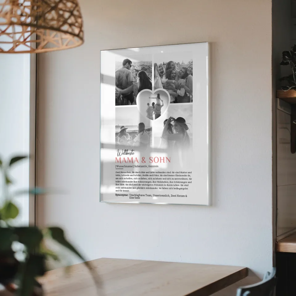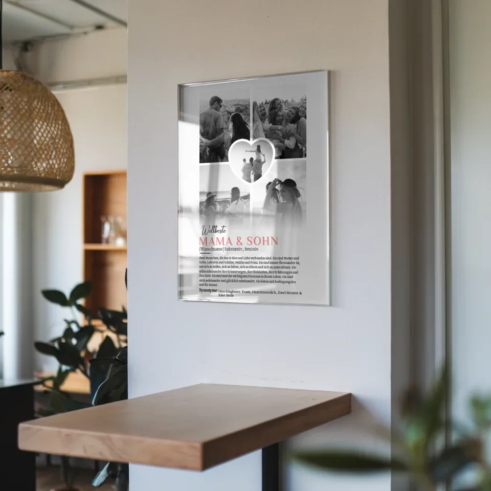 Das Acrylglas Bild ist nicht nur ein echter Hingucker, sondern auch eine liebevolle Erinnerung, die in jedem Zuhause einen Platz findet. Mit der Definition von Mama & Sohn wird die besondere Beziehung in einem zeitlosen und eleganten Design festgehalten. Die Kombination von Black & White sorgt dafĂŒr, dass die Fotos in einem harmonischen und modernen Stil prĂ€sentiert werden.