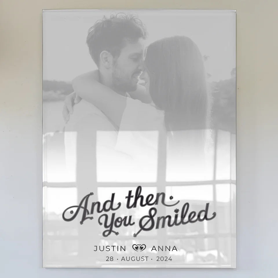 Bei diesem exklusiven Produkt hast du die Möglichkeit, dein Bild individuell zu gestalten. Lade ein Foto hoch und füge einen eigenen Spruch oder Wunschtext hinzu. Vergiss nicht, die Namen und das Datum zu personalisieren, damit dein Acrylglas Bild wirklich einzigartig wird. Auf dem Design findest du den bezaubernden Spruch 'And Then You Smiled', der jedes Paar zum Strahlen bringt.