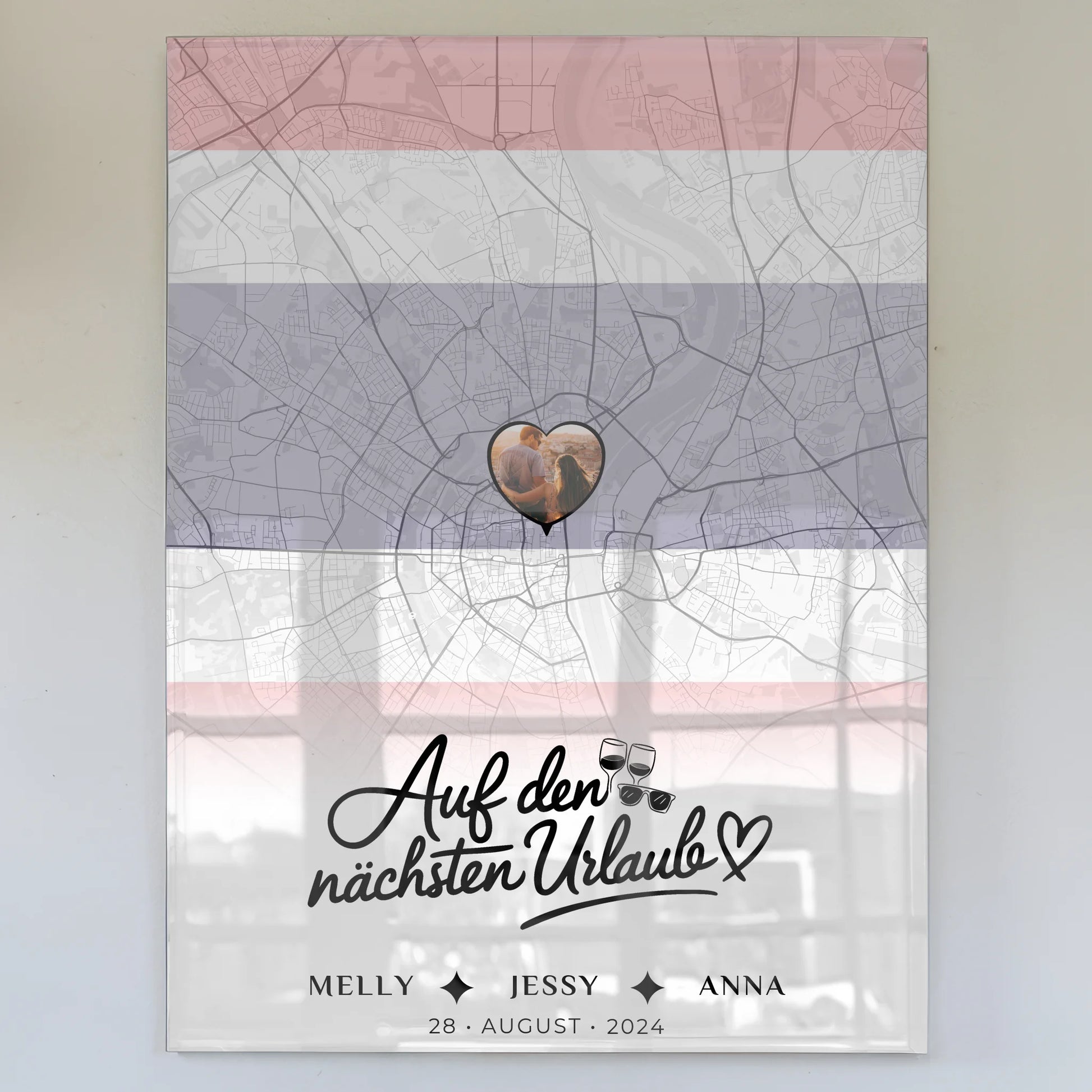 Suchst Du nach einem einzigartigen Geschenk? Das personalisierte Acrylglas Bild Schwester Stadtkarte Thailand Foto ist die perfekte Wahl! Mit diesem besonderen Kunstwerk kannst Du nicht nur ein spezielles Foto, sondern auch eine Karte mit einem bedeutenden Ort gestalten. ErgÀnze Dein Geschenk mit bis zu 5 Namen und einem eigenen Spruch oder Wunschtext. Der schöne Spruch 'Auf Den NÀchsten Urlaub' macht das Design zusÀtzlich zu einem echten Hingucker.