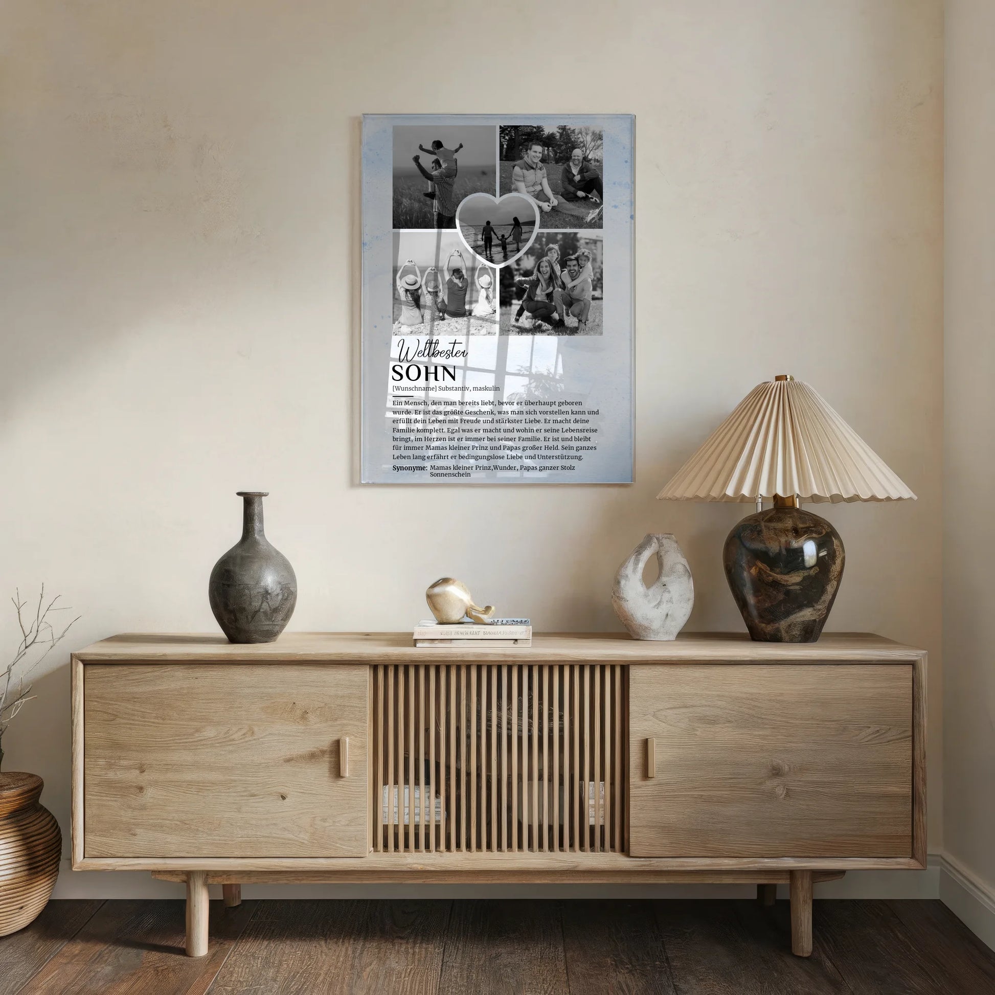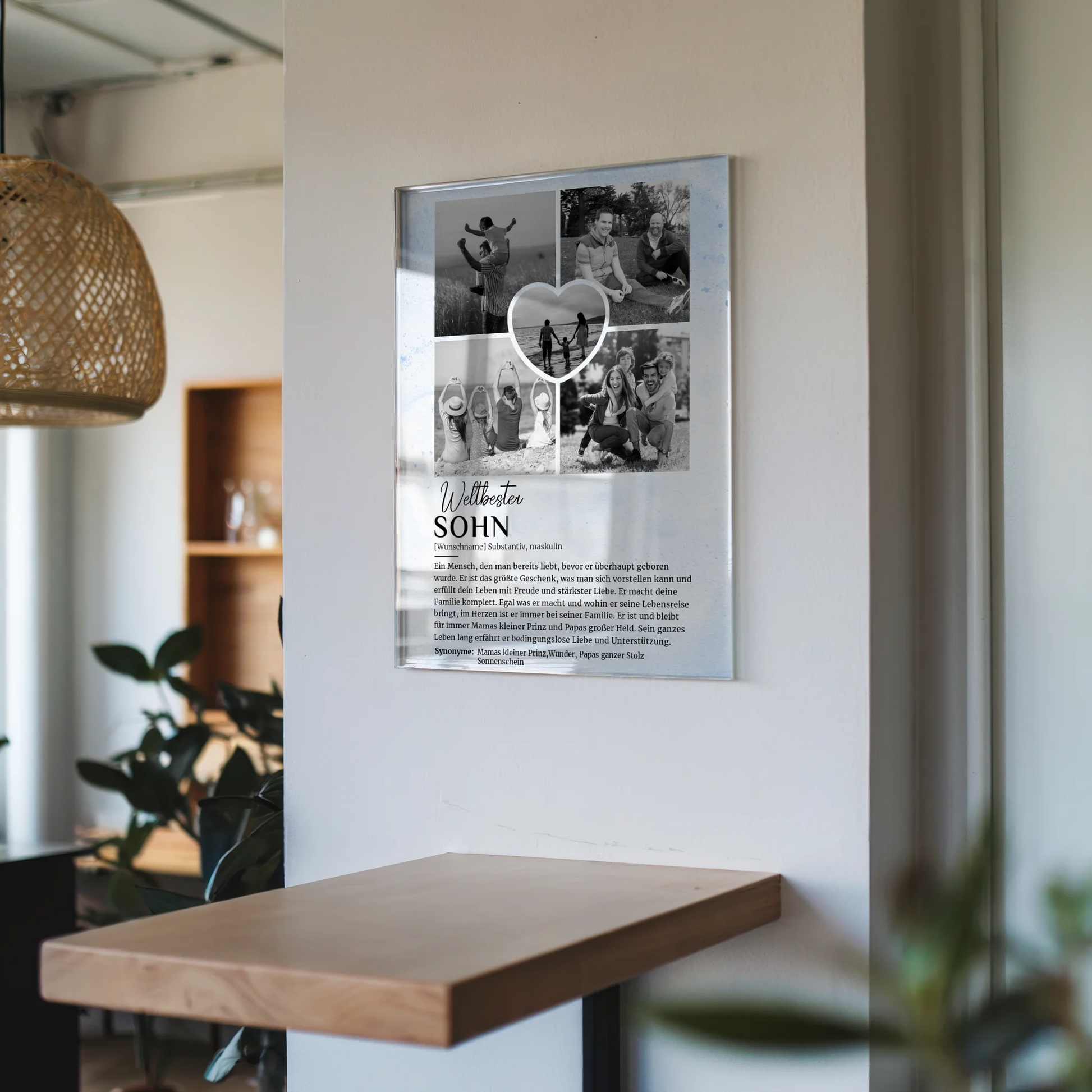 Setze auf ein Acrylglas Bild, das Deine Persönlichkeit und Deine liebsten Augenblicke verkörpert. Jeder Blick auf dieses individuelle Kunstwerk wird ein Lächeln auf Dein Gesicht zaubern und Herzen berühren. Bestelle jetzt und überrasche Deinen Sohn mit einem besonderen Geschenk, das ihn ein Leben lang begleiten wird!