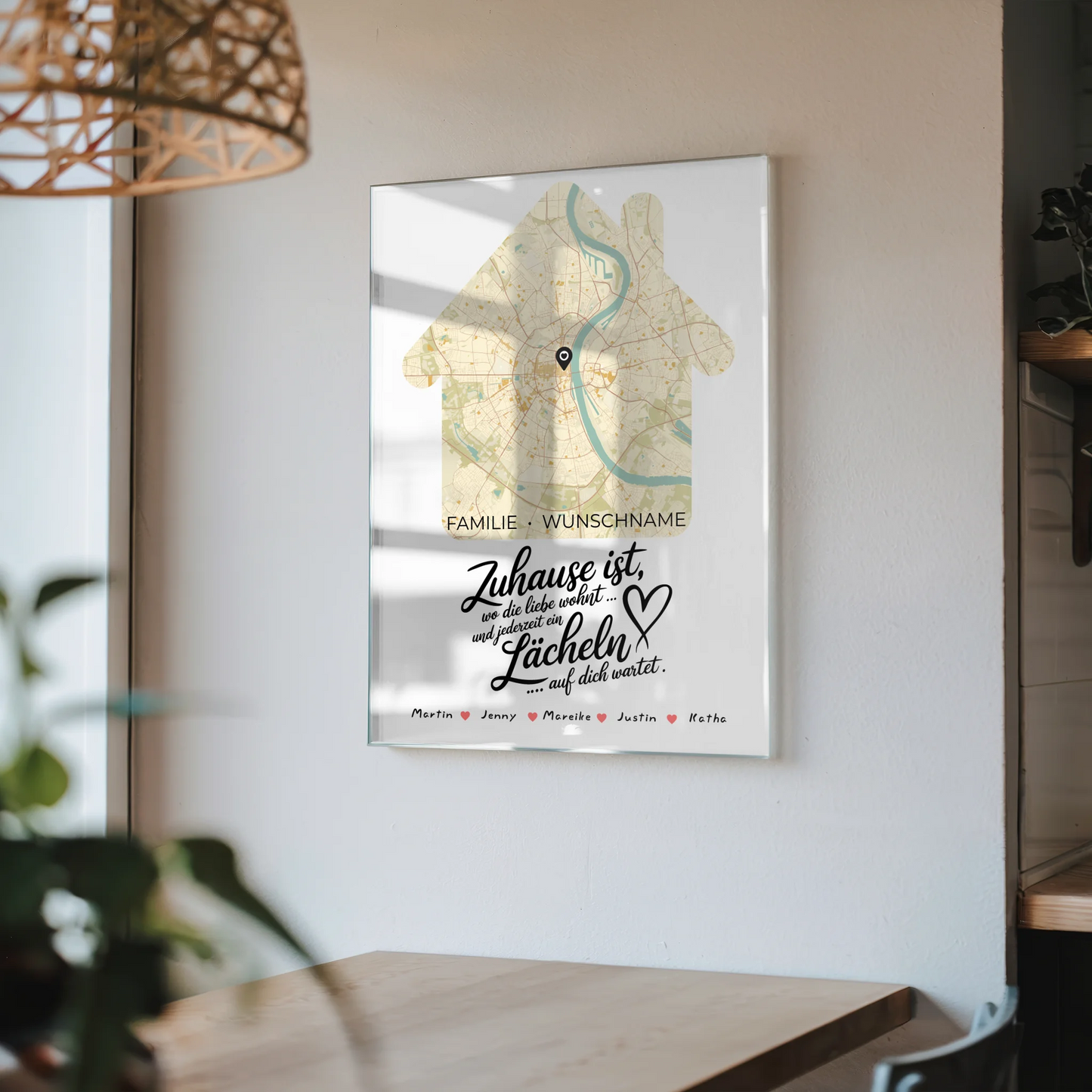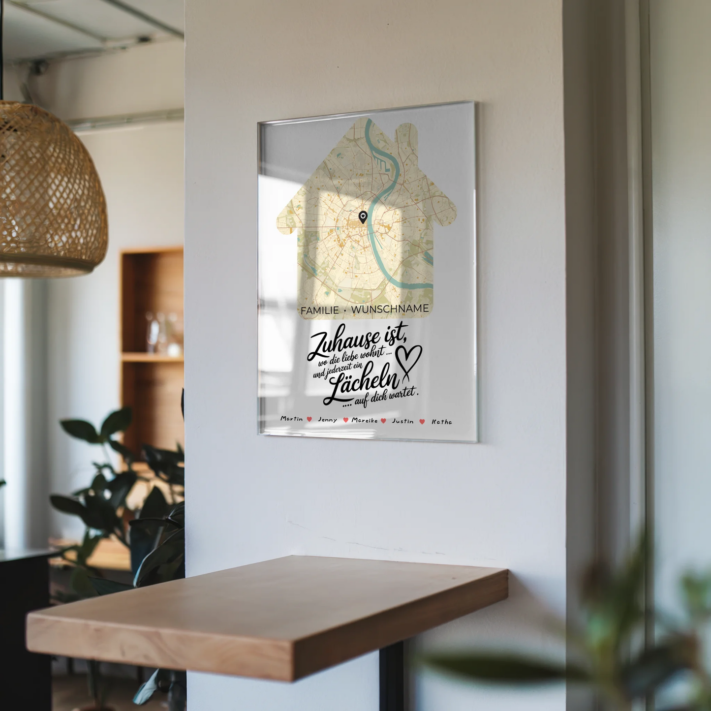 Personalisiertes Acrylglas Bild Spruch Familie Stadtkarte Wo die Liebe Wohnt Hausform mit Nachname