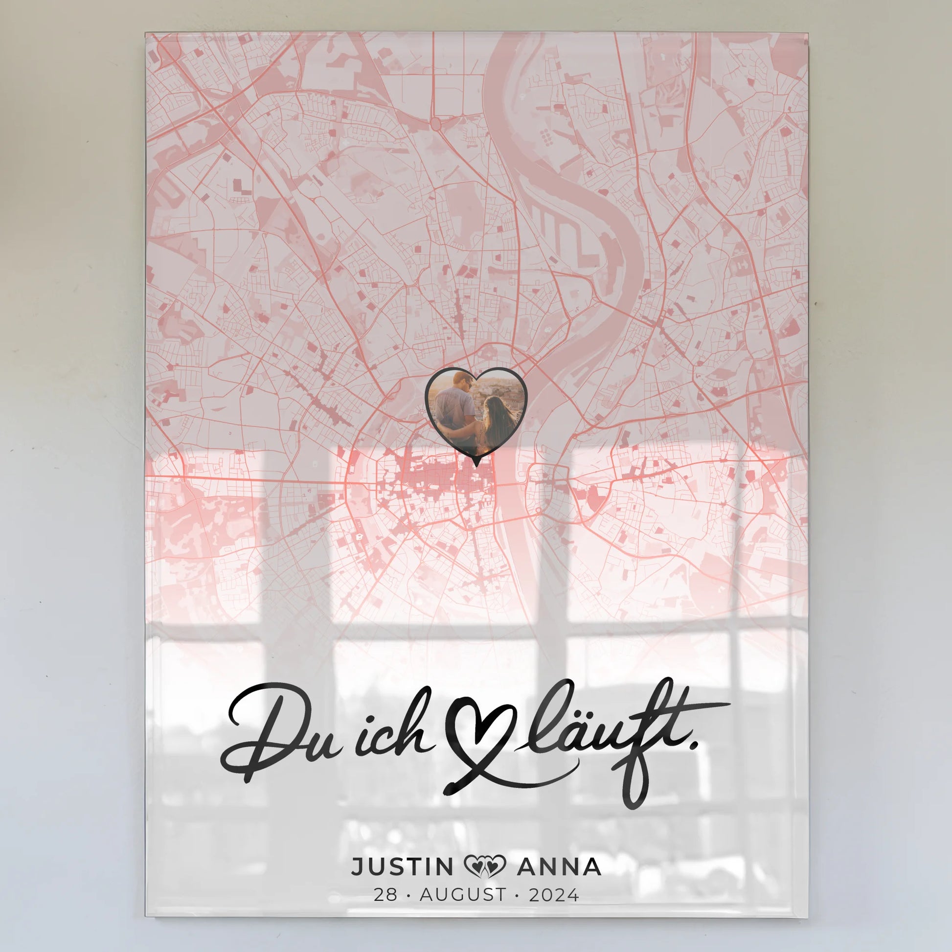 Das designte Bild trägt den liebevollen Spruch 'Du Ich Läuft', der eure Verbundenheit auf eine ganz besondere Art und Weise ausdrückt. Dieses Acrylglas Bild ist nicht nur ein schönes Dekorationsstück, sondern auch eine wunderbare Erinnerung an den Moment, wo alles begann. Nutze die Möglichkeit, euer ganz persönliches Stadtkarten Acrylglas Bild zu kreieren und somit ein Stück von euch in eure vier Wände zu bringen.
