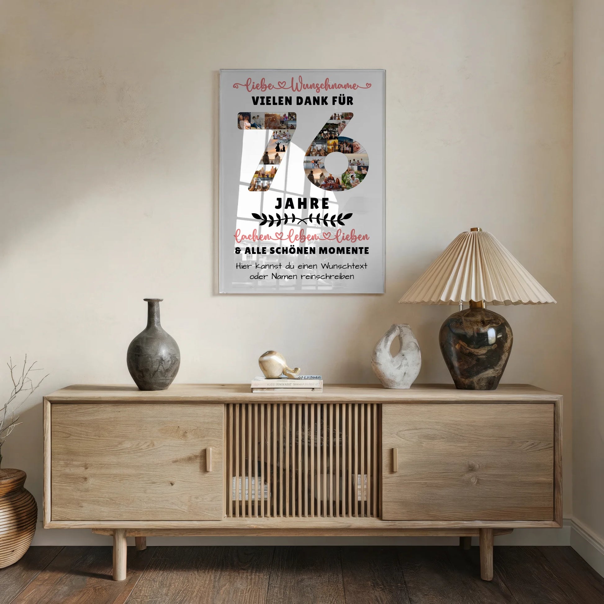 Überrasche deine Liebsten mit einem einzigartigen Geschenk zum 76. Geburtstag – unserem personalisierten Acrylglas Wandbild. Dieses besondere Geschenk ist perfekt für Papa, Mama, Oma, Opa sowie für andere Familienmitglieder wie Schwester, Bruder, Neffe oder Nichte. Das personalisierte Acrylglas Wandbild bietet dir die Möglichkeit, über 20+ Fotos, den Namen des Geburtstagskinds, einen Wunschtext und ein Hintergrundbild individuell zu gestalten. So entsteht ein einzigartiges Erinnerungsstück, das garantiert für Freude sorgt und den besonderen Tag unvergesslich macht. Ob als Geschenk für Papa, Mama oder die Großeltern – dieses personalisierte Acrylglas Wandbild ist eine elegante und persönliche Dekoration für jeden Raum. Es eignet sich ideal für den 76 Geburtstag und zeigt deine Wertschätzung auf kreative Weise. Gestalte jetzt dein persönliches Geschenk für Oma & Opa oder andere Familienmitglieder und mache den Ehrentag zu etwas ganz Besonderem! Dieses individuelle Wandbild ist nicht nur ein schönes Dekorationsstück, sondern auch ein emotionaler Ausdruck deiner Liebe und Verbundenheit.