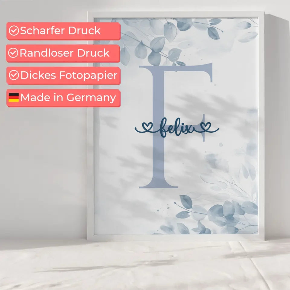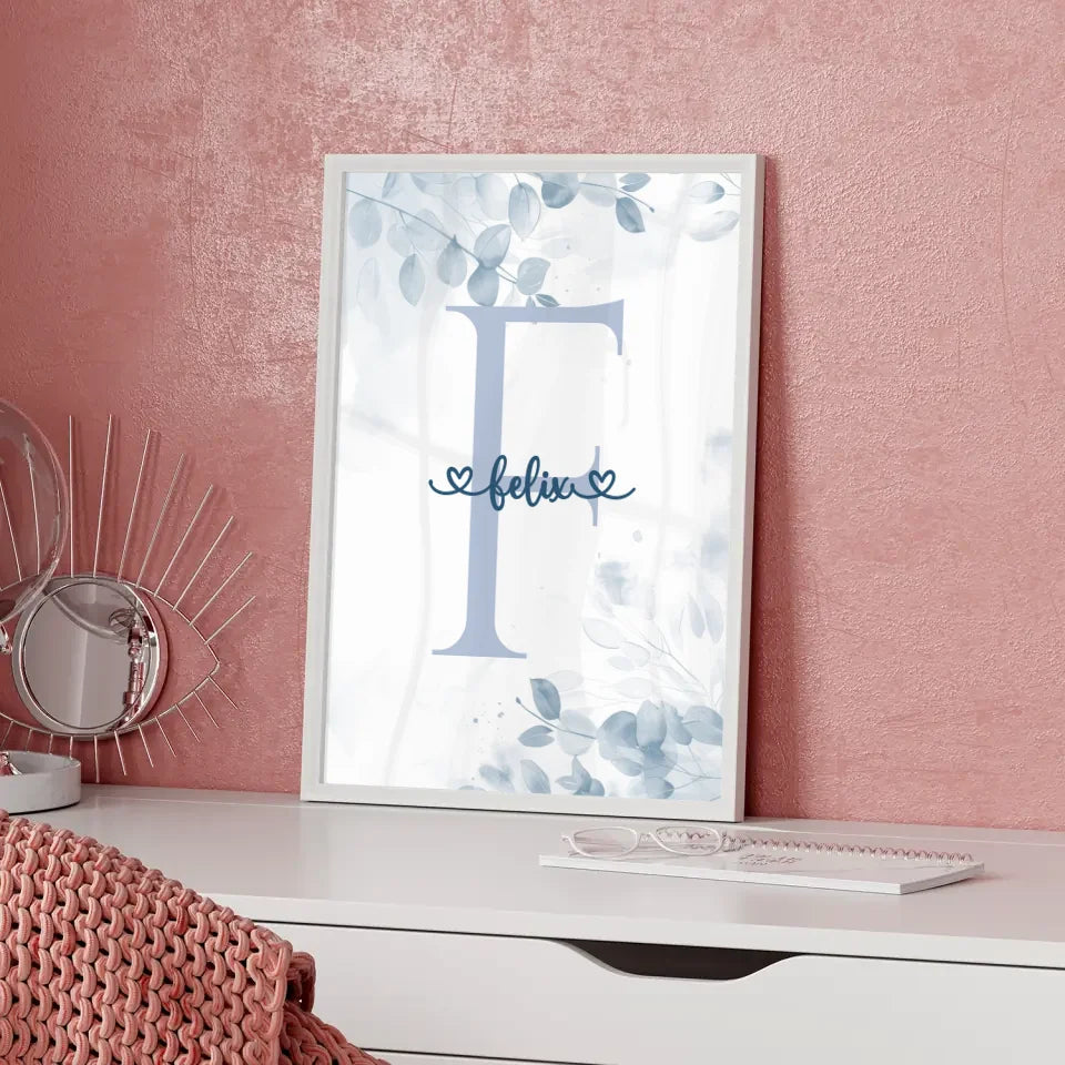 Suchst du ein einzigartiges und persönliches Geschenk für einen besonderen Jungen in deinem Leben? Mit unserem personalisierten Buchstaben Poster Buchstabe F Blau für Jungen zauberst du garantiert ein Lächeln auf sein Gesicht! Dieses wunderschöne Poster lässt sich ganz individuell gestalten: Wähle den Initialbuchstaben, den Namen und das Hintergrundbild, um ein echtes Unikat zu schaffen. Das personalisiertes Buchstaben Poster eignet sich hervorragend als Geschenk zum Geburtstag oder zu Weihnachten und bringt Farbe und Persönlichkeit in jedes Kinderzimmer.