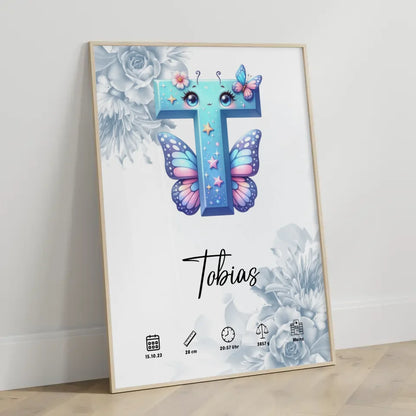 Personalisiertes Buchstaben Poster Buchstabe T Blüten Blau Geburt A-Z