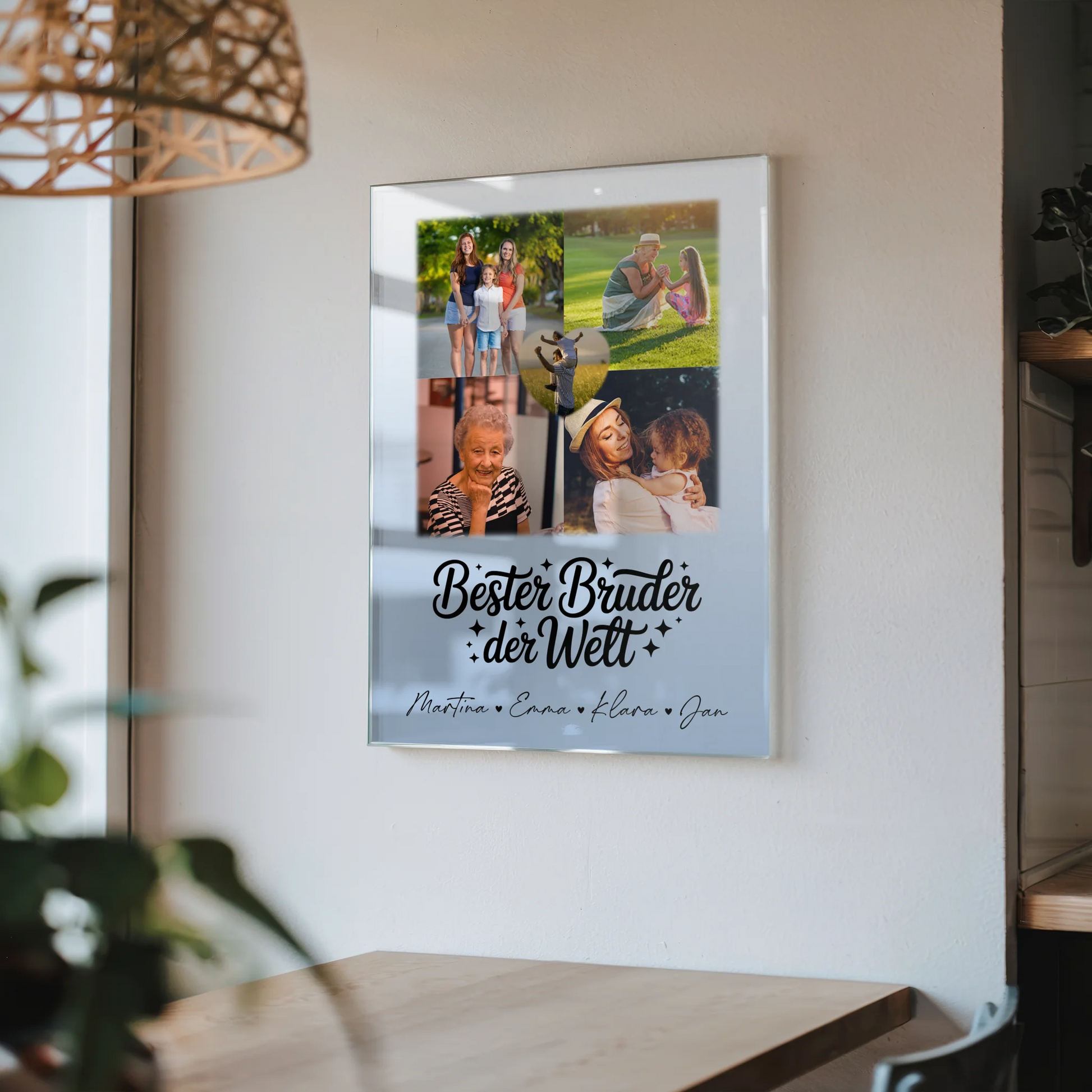 Überrasche deinen Bruder mit einem einzigartigen und persönlichen Geschenk – dem Personalisiertes Foto Acrylglas mit 4 Fotos und Herz für den besten Bruder der Welt. Dieses hochwertige Acrylglas wird individuell mit bis zu 5 Fotos, deinem eigenen Spruch oder Wunschtext sowie den Namen deines Bruders gestaltet und ist somit das perfekte Fotocollage für Bruder. Das stilvolle Design zeigt den liebevollen Spruch: „Bester Bruder der Welt“ und macht dieses Geschenk zu einem echten Blickfang. Ob Geburtstag, Weihnachten, Jubiläum oder einfach nur so – dieses personalisierte Acrylglas ist für jeden Anlass geeignet und bringt deinem Bruder garantiert ein Lächeln ins Gesicht. Zeige deine Wertschätzung und schaffe ein unvergessliches Erinnerungsstück, das er immer bei sich tragen kann. Bestelle jetzt dein individuelles Personalisiertes Foto Acrylglas mit 4 Fotos und Herz für den besten Bruder der Welt und mache deinem Bruder eine besondere Freude!