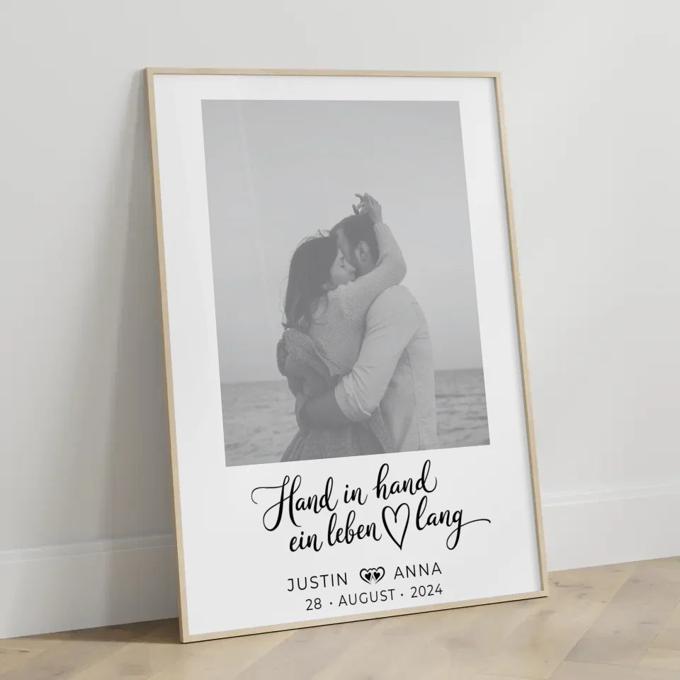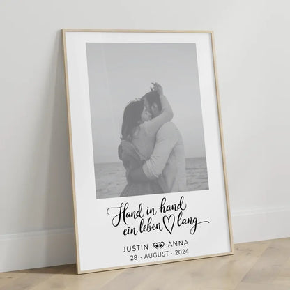 Hol dir jetzt dein personalisiertes Foto Poster Paare Mit Namen Hand In Hand Ein Leben Lang und mache jede Wand zu einem Ausdruck deiner gemeinsamen Liebe. Gestalte ein Stück Erinnerung, das für immer bleibt!