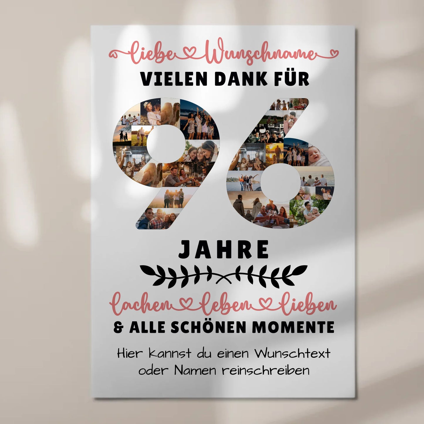 Überrasche deine Liebsten mit einem einzigartigen und persönlichen Geschenk: Das Personalisiertes Fotoboard Magnetisch 96 Geburtstag Für Oma Opa Mama & Papa. Dieses individuell gestaltbare Fotoboard ist die ideale Erinnerung für den besonderen Tag und eignet sich perfekt für alle, die ihren Familienmitgliedern eine besondere Freude machen möchten. Du kannst mehr als 20 Fotos, den Namen, einen Wunschtext sowie ein Hintergrundbild nach deinen Wünschen personalisieren. So entsteht ein einzigartiges Erinnerungsstück, das garantiert für Begeisterung sorgt. Das Personalisiertes Fotoboard Magnetisch ist vielseitig einsetzbar und eignet sich hervorragend als Geschenk zum 96 Geburtstag. Ob für Oma, Opa, Mama, Papa, den Sohn, die Töchter, Geschwister, beste Freunde, Neffen oder Nichten – dieses personalisierte Fotoboard ist das perfekte Präsent für jeden Anlass. Es ist nicht nur eine schöne Dekoration, sondern auch eine liebevolle Erinnerung an gemeinsame Momente. Überzeuge dich selbst von der hochwertigen Verarbeitung und der individuellen Gestaltungsmöglichkeit dieses besonderen Geschenks. Mach den 96 Geburtstag deiner Liebsten unvergesslich mit einem personalisierten Fotoboard, das Herzen berührt!