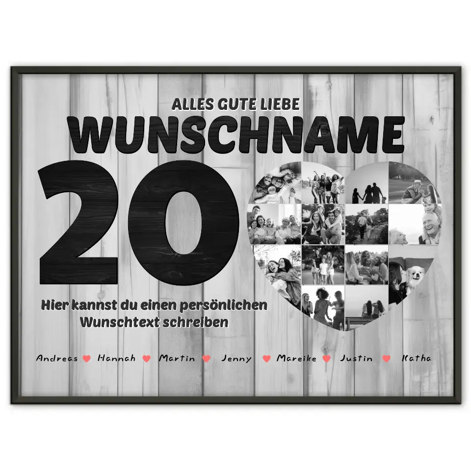 Du kannst bei diesem schönen Design 15 Namen, 14 Fotos, Hintergrundbild & Wunschtext ganz individuell personalisieren.
