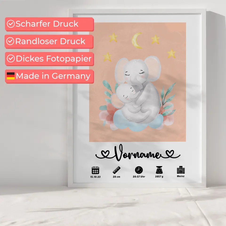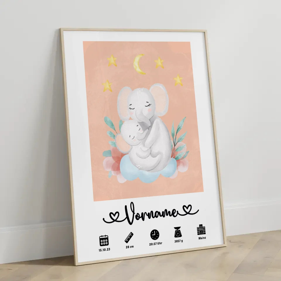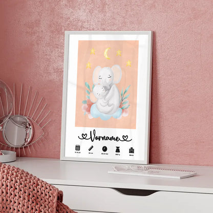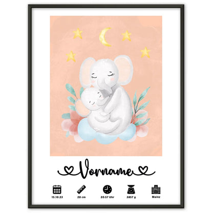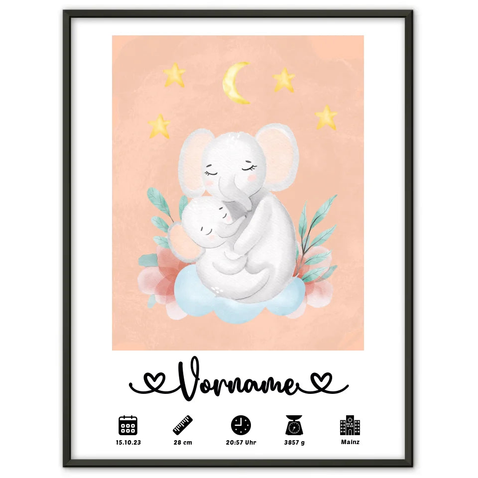 Personalisiertes Geburtsposter mit Geburtsdaten Elefanten Mama Beigerot