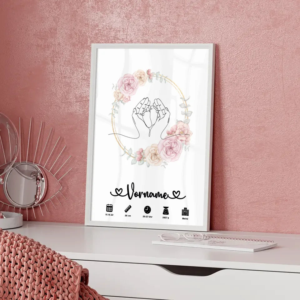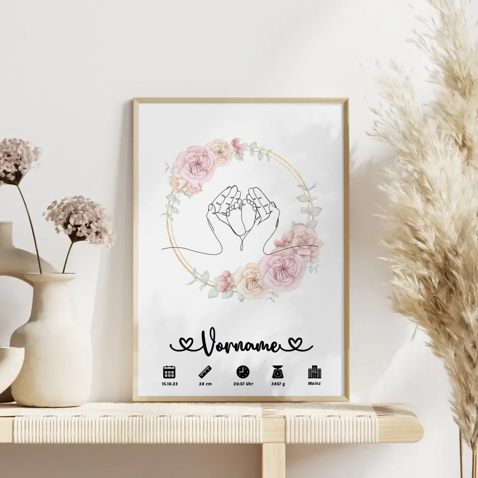 Personalisiertes Geburtsposter mit Geburtsdaten Floral Kreis Babyfüße Lineart