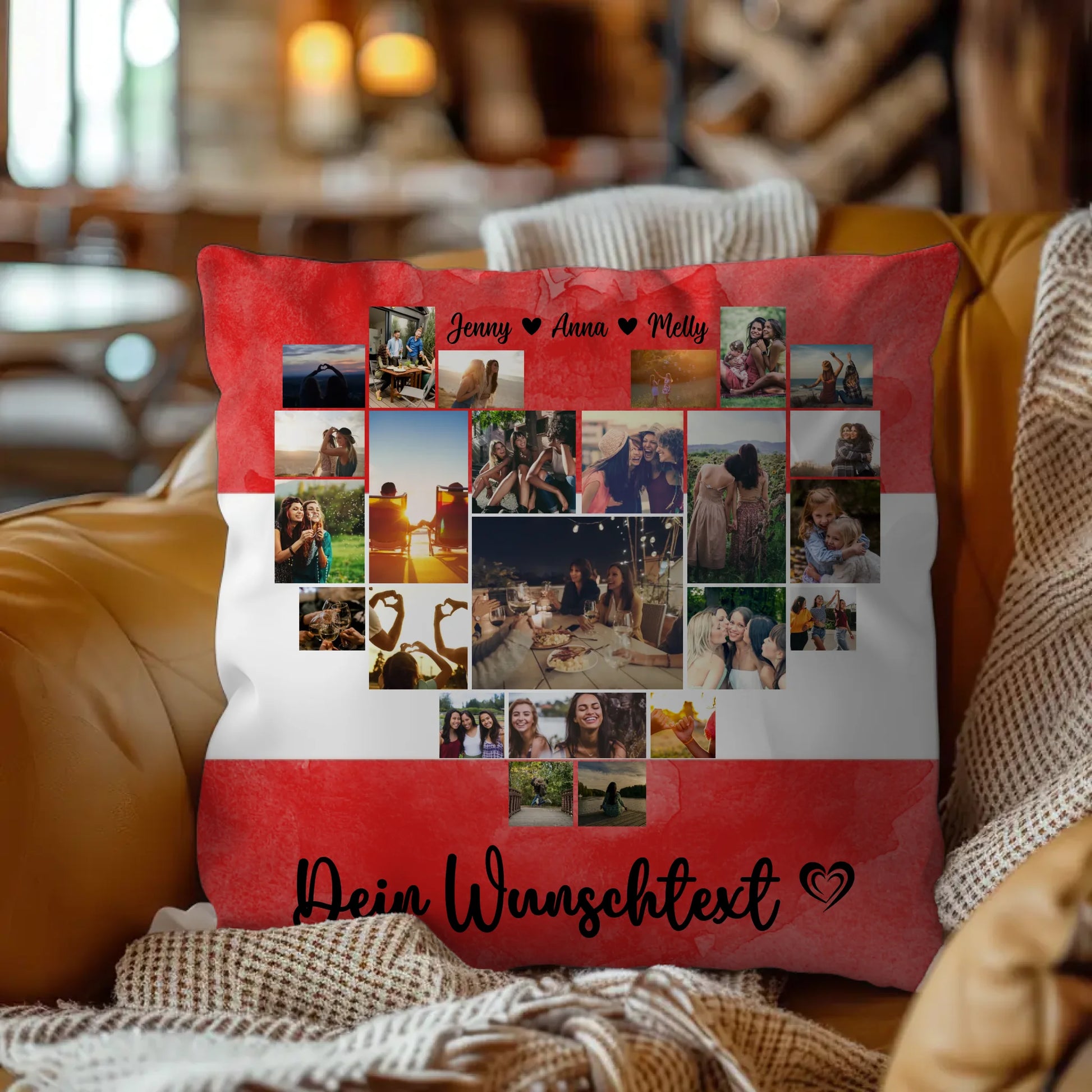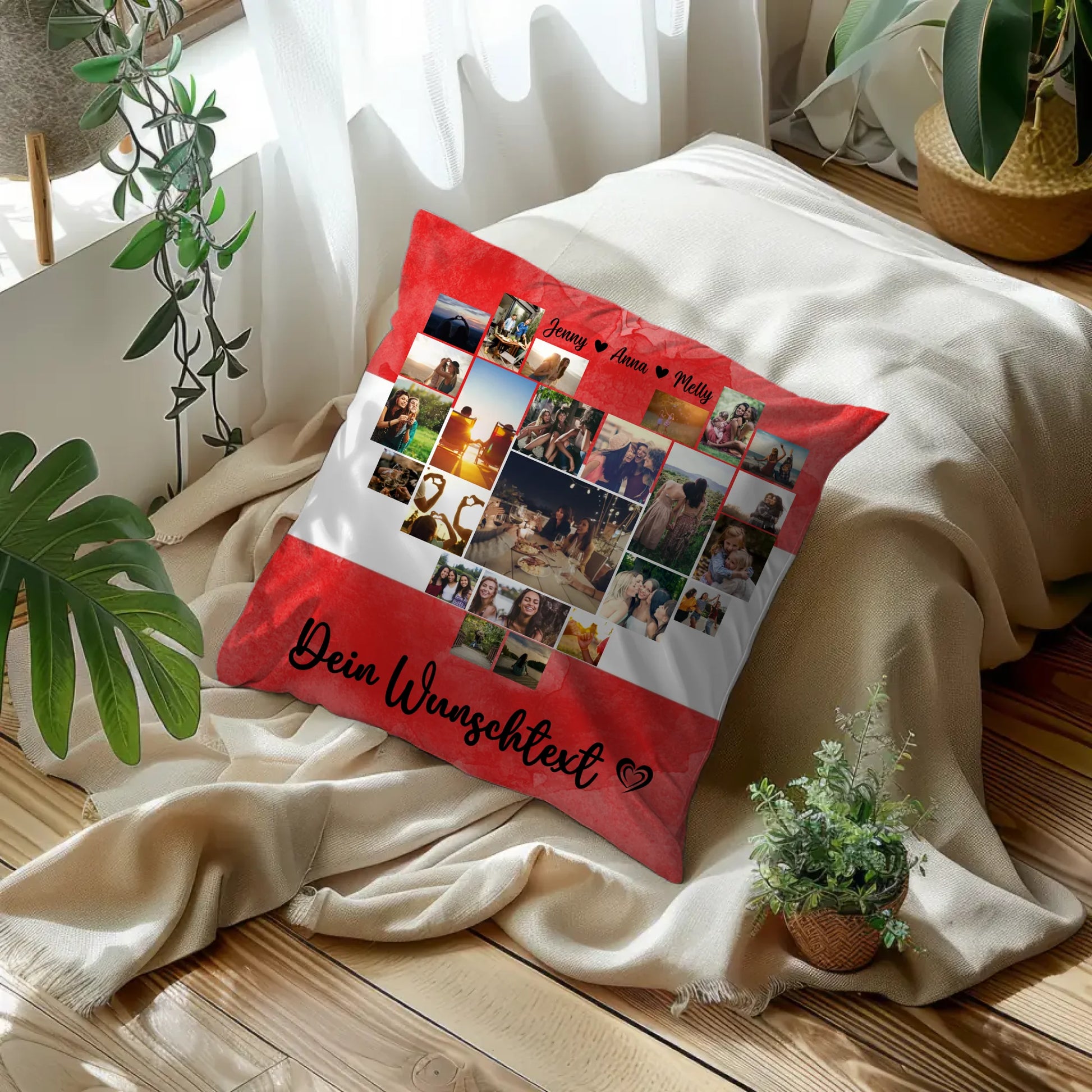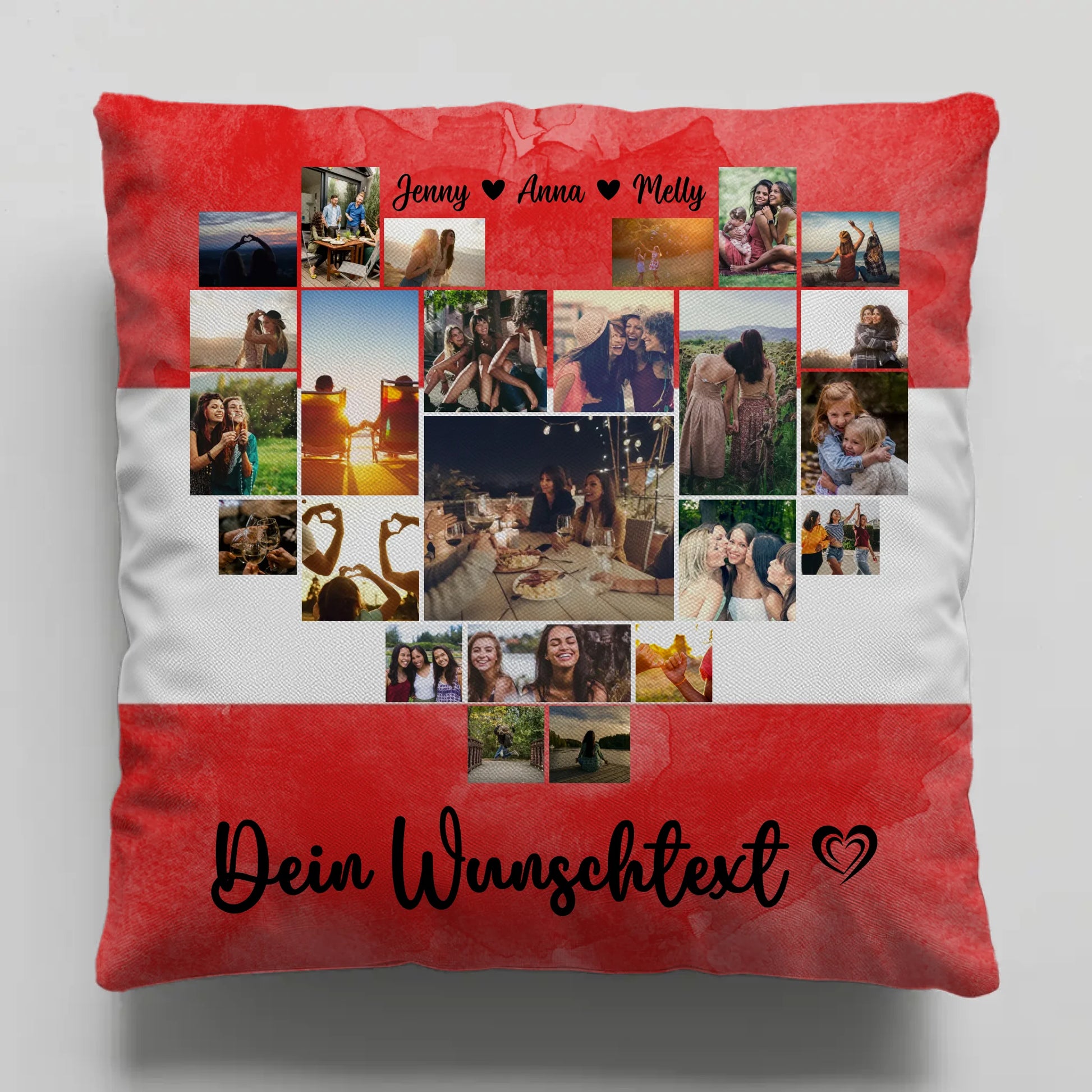 Entdecke das ideale Geschenk für Deine Liebsten mit unserem personalisierten Kissen Paare Urlaub Erinnerung Österreich. Gestalte ein einzigartiges Geschenk, das unvergessliche Momente festhält und Liebe zum Ausdruck bringt. Dieses Kissen ist nicht nur ein schönes Dekorationsobjekt, sondern auch eine liebevolle Erinnerung an gemeinsame Reisen und Erlebnisse. Du kannst die Namen des Paares, über 20+ Fotos, ein individuelles Hintergrundbild sowie einen persönlichen Spruch oder Wunschtext einfügen. So wird Dein personalisiertes Kissen Paare zu einem ganz besonderen Meisterwerk der Fotocollage. Egal ob zum Valentinstag oder einfach nur um Danke zu sagen - dieses Geschenk trifft immer ins Herz! Überrasche Deine bessere Hälfte oder Deine beste Freundin mit einer zauberhaften Erinnerung an schöne Zeit in Österreich. Jedes Mal, wenn sie auf das Kissen schaut, werden die Urlaubserinnerungen, die gemeinsamen Reisen und die tollen Augenblicke in den Vordergrund rücken. Verschenke ein Stück Heimat mit einem Hauch von Nostalgie - perfekt geeignet als kreative Geschenkidee für jeden Anlass!