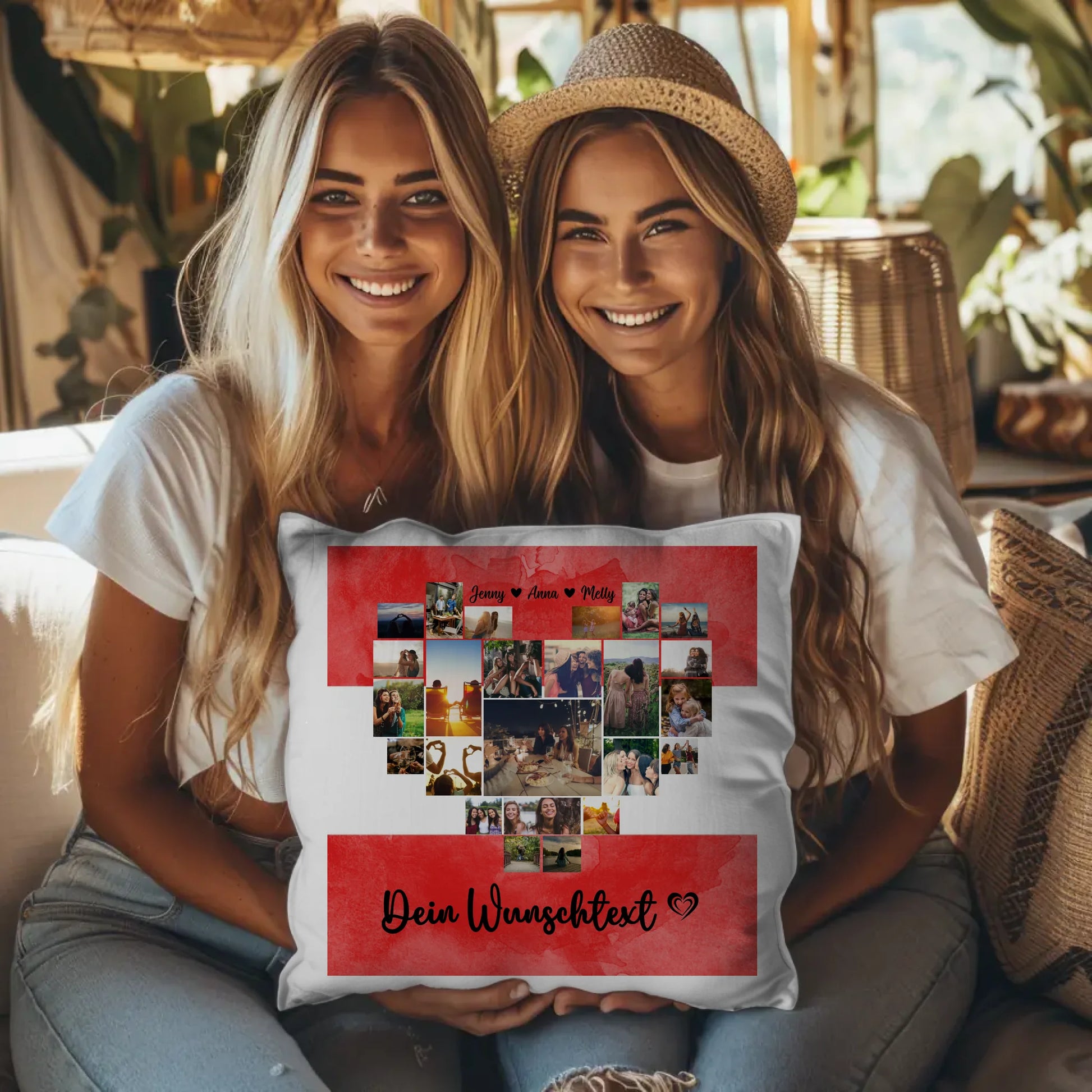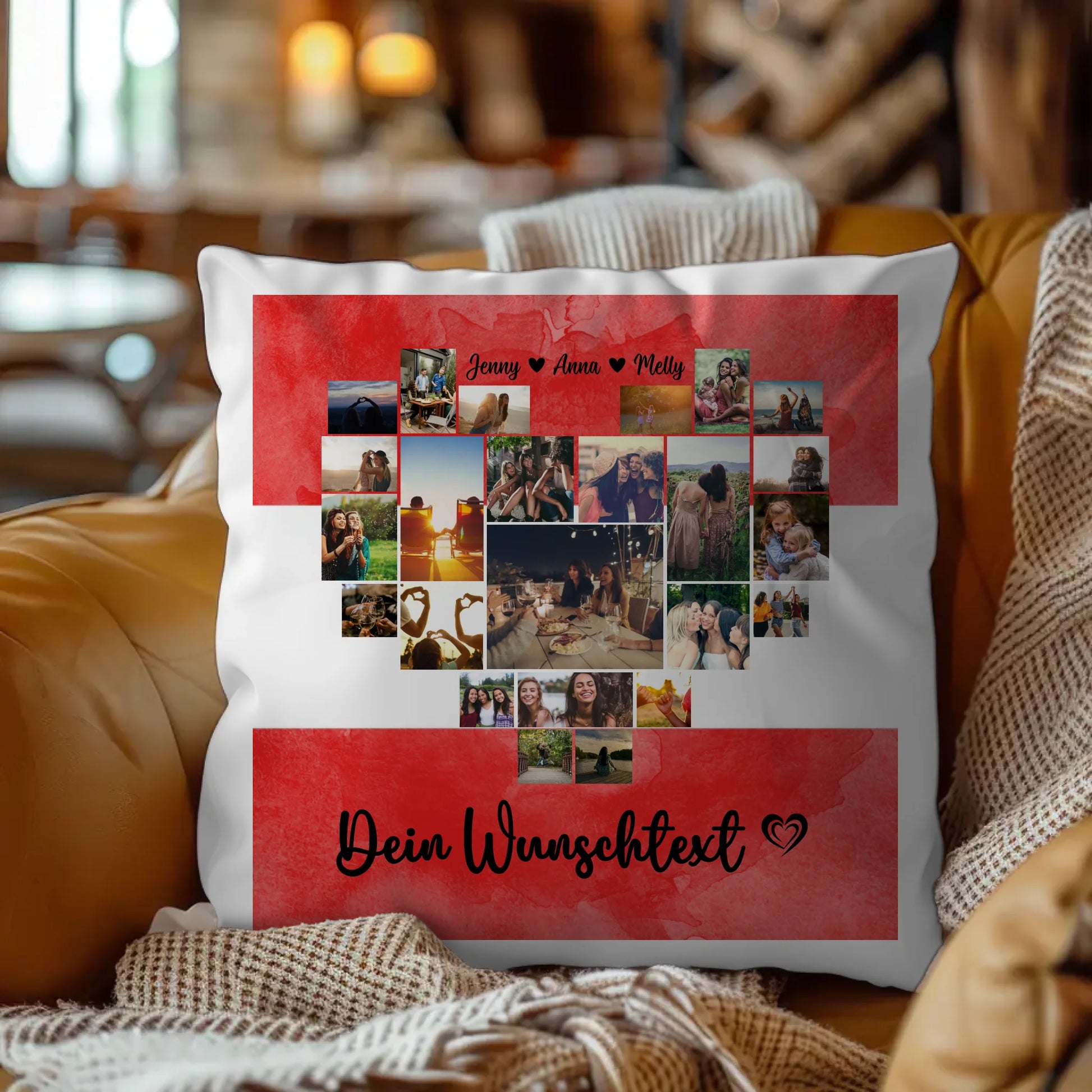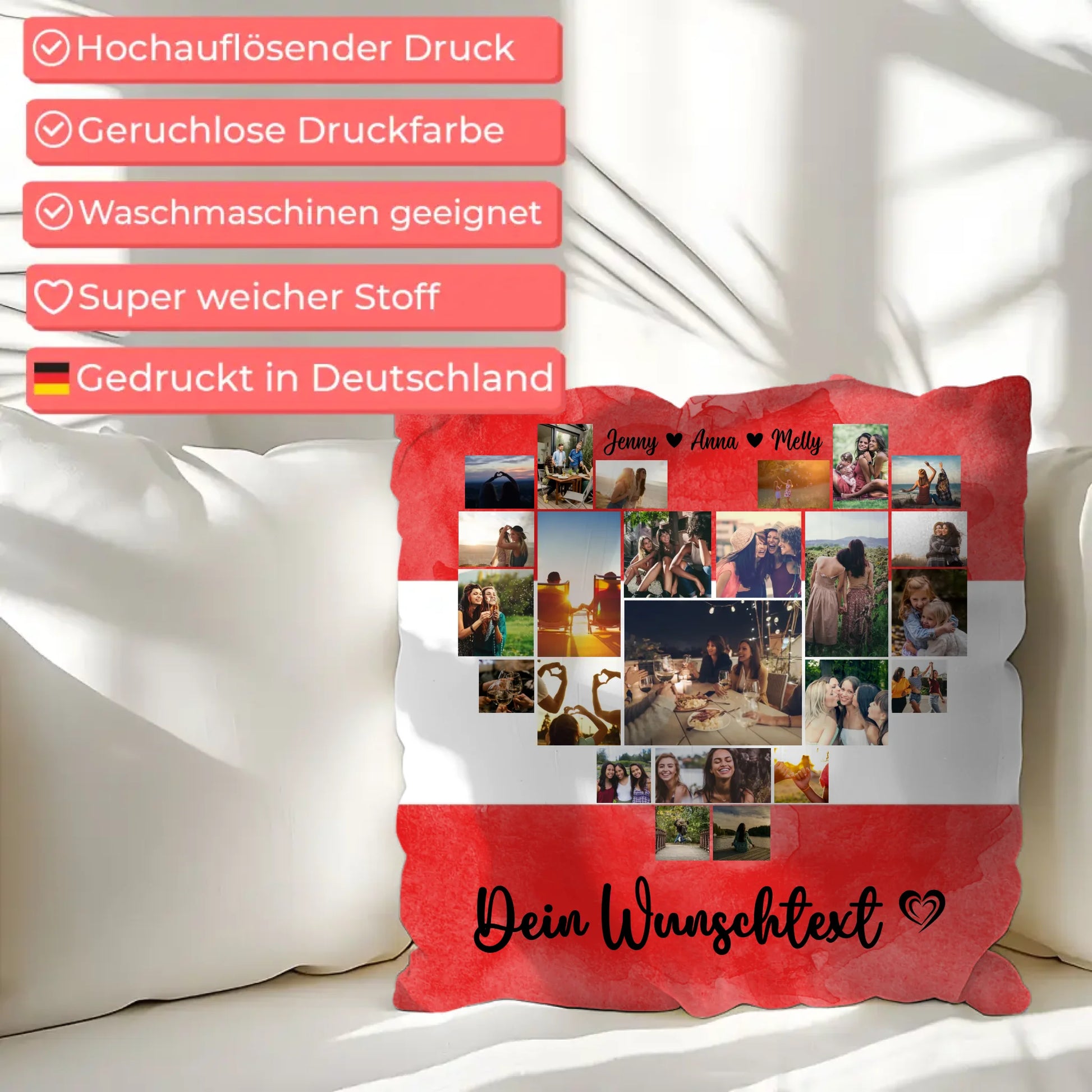 Entdecke das ideale Geschenk für Deine Liebsten mit unserem personalisierten Kissen Paare Urlaub Erinnerung Österreich. Gestalte ein einzigartiges Geschenk, das unvergessliche Momente festhält und Liebe zum Ausdruck bringt. Dieses Kissen ist nicht nur ein schönes Dekorationsobjekt, sondern auch eine liebevolle Erinnerung an gemeinsame Reisen und Erlebnisse. Du kannst die Namen des Paares, über 20+ Fotos, ein individuelles Hintergrundbild sowie einen persönlichen Spruch oder Wunschtext einfügen. So wird Dein personalisiertes Kissen Paare zu einem ganz besonderen Meisterwerk der Fotocollage. Egal ob zum Valentinstag oder einfach nur um Danke zu sagen - dieses Geschenk trifft immer ins Herz! Überrasche Deine bessere Hälfte oder Deine beste Freundin mit einer zauberhaften Erinnerung an schöne Zeit in Österreich. Jedes Mal, wenn sie auf das Kissen schaut, werden die Urlaubserinnerungen, die gemeinsamen Reisen und die tollen Augenblicke in den Vordergrund rücken. Verschenke ein Stück Heimat mit einem Hauch von Nostalgie - perfekt geeignet als kreative Geschenkidee für jeden Anlass!