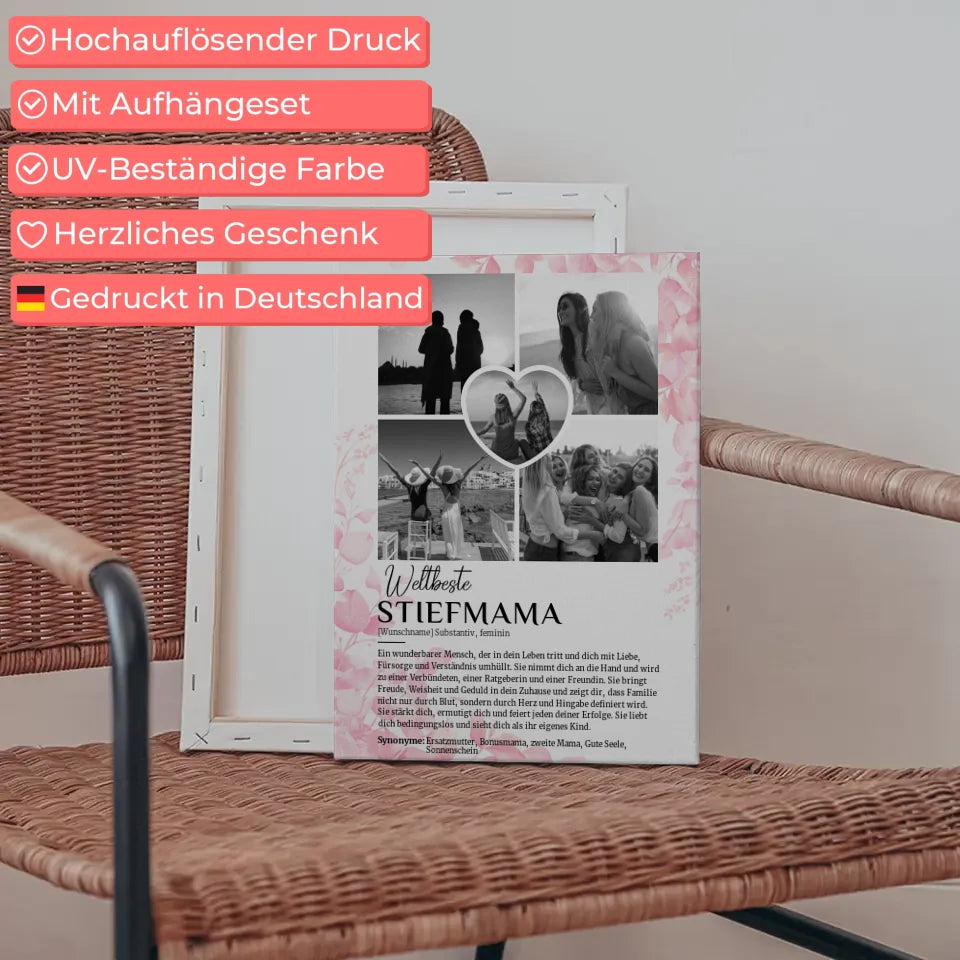 Verleihe deiner Stiefmama ein Geschenk, das von Herzen kommt – unser personalisiertes Leinwand mit Definition Stiefmama wird sie begeistern und ein Lächeln auf ihr Gesicht zaubern!