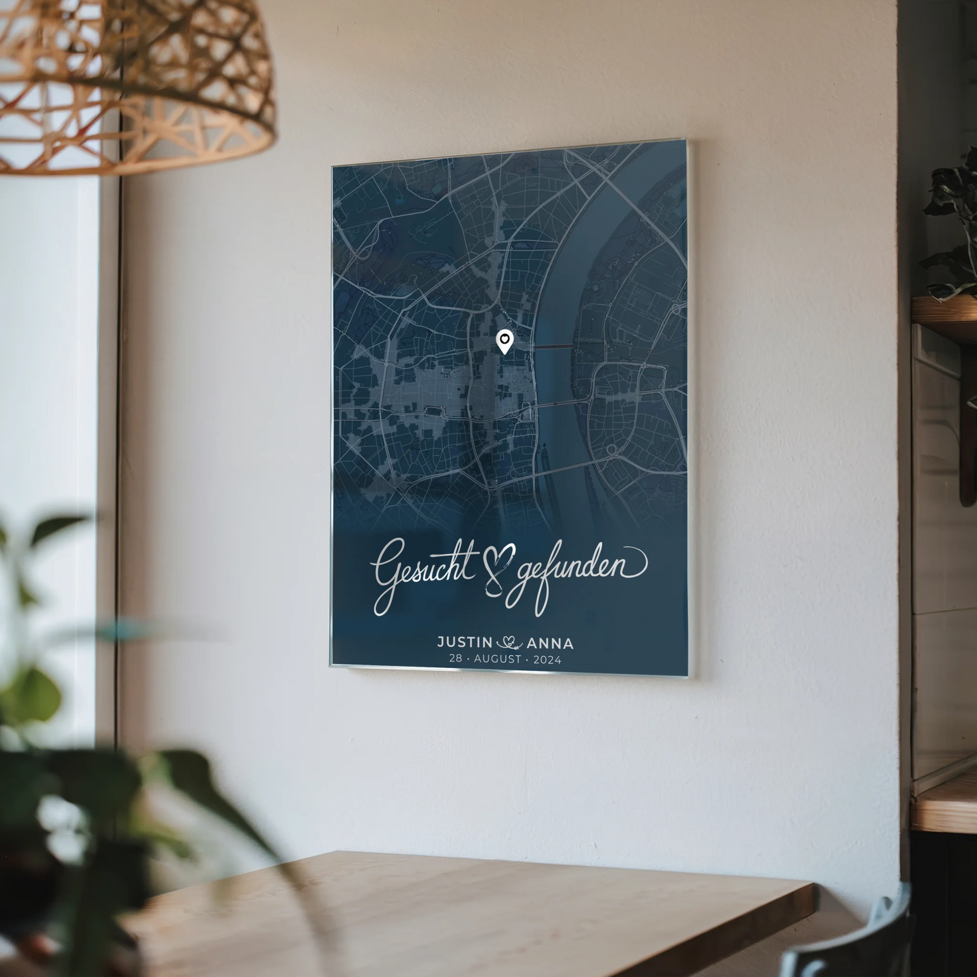 Entdecke das Personalisiertes Liebes Acrylglas Bild Stadtkarte Paare Blau Gesucht Gefunden