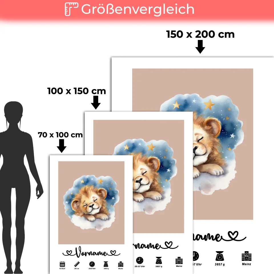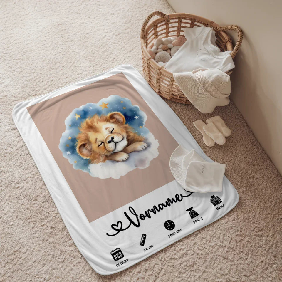 Die Decke ist individuell gestaltbar und lässt sich mit wichtigen Geburtsdaten wie Gewicht, Größe, Uhrzeit und Datum sowie dem Namen deines Babys personalisieren. So wird jede Decke zu einem ganz besonderen Erinnerungsstück. Das zarte Altrosa und das süße Löwenbaby-Design machen die Decke nicht nur zu einem praktischen Begleiter, sondern auch zu einem stilvollen Hingucker im Kinderzimmer.