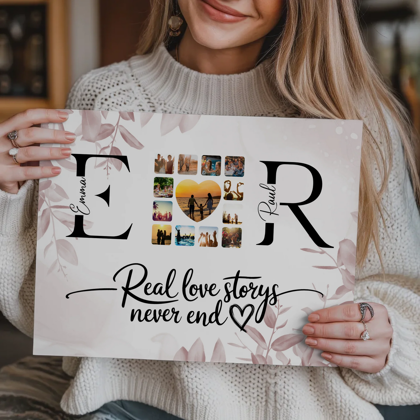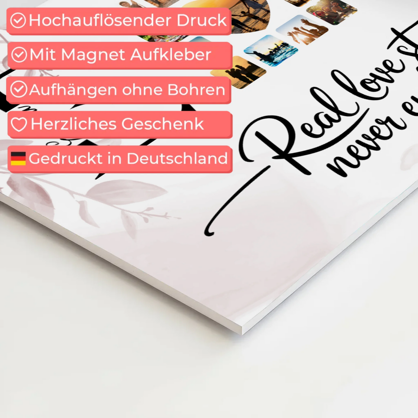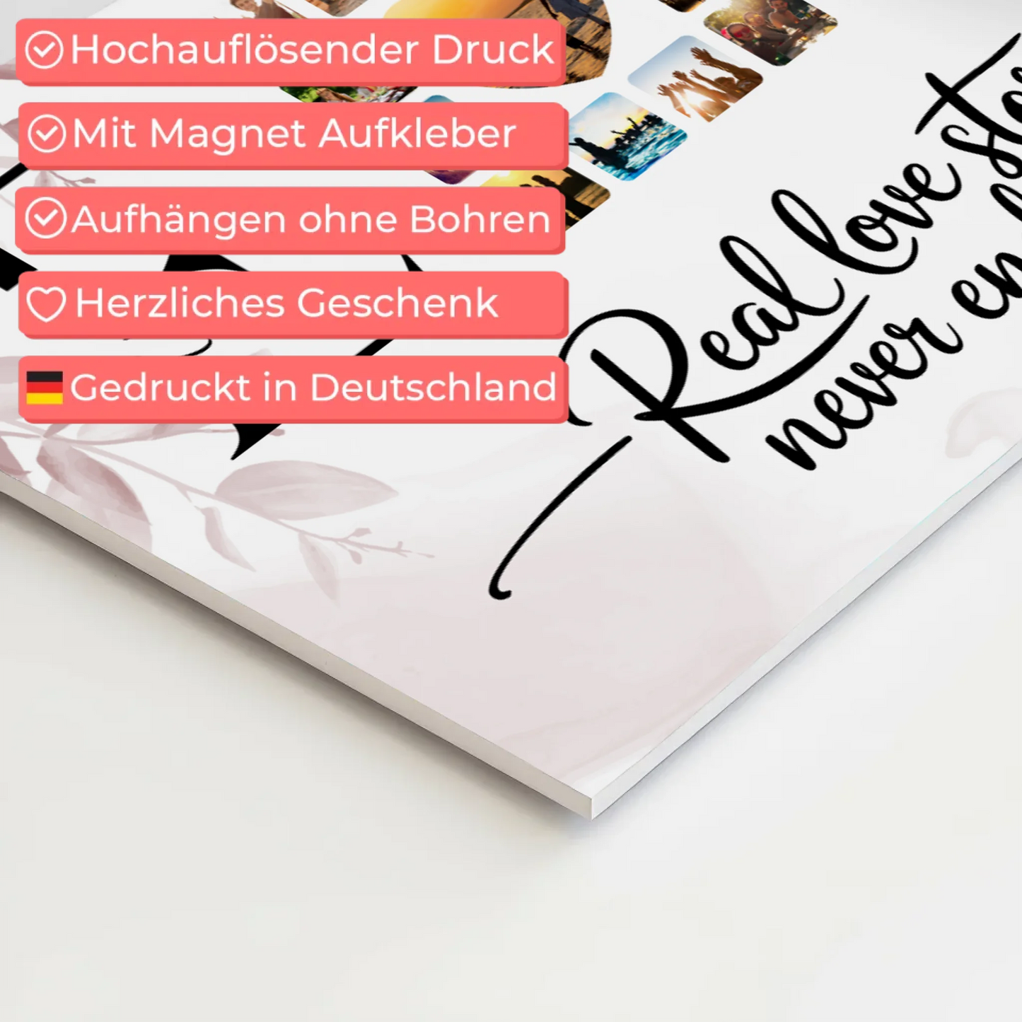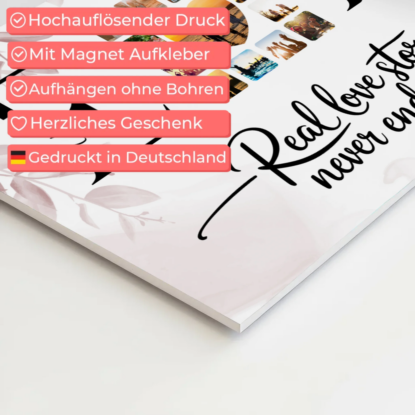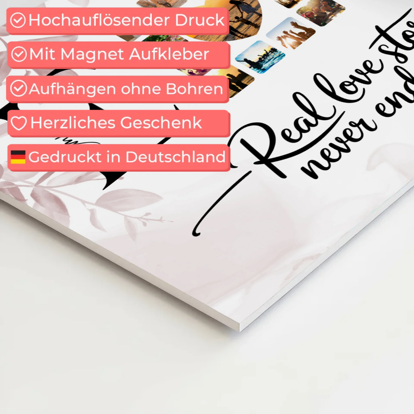 Überrasche deine Liebsten mit dem einzigartigen Personalisierten Magnet Fotoboard Liebe Mit Initialien Namen und Fotos. Dieses liebevoll gestaltete Geschenk ist ideal, um eure gemeinsame Geschichte zu feiern und eure Liebe auf besondere Weise festzuhalten. Das Design trägt den inspirierenden Spruch Real Love Storys Never End, der eure ewige Verbundenheit symbolisiert. Du kannst das Magnet Fotoboard individuell anpassen, indem du die Initialen, Namen, Fotos sowie das Hintergrundbild nach deinen Wünschen gestaltest. So wird dein Geschenk zu einem persönlichen Unikat, das Erinnerungen schafft und immer wieder Freude bereitet. Perfekt geeignet als Geschenk für Paare zum Valentinstag oder andere besondere Anlässe, um eure Liebe sichtbar zu machen. Das Personalisiertes Magnet Fotoboard Liebe mit Initialien Namen und Fotos ist nicht nur ein dekoratives Element, sondern auch eine schöne Erinnerung an eure gemeinsame Zeit. Zeige deinem Partner oder deiner Partnerin, wie sehr du eure Liebesgeschichte schätzt – mit einem individuellen Geschenk, das niemals endet.