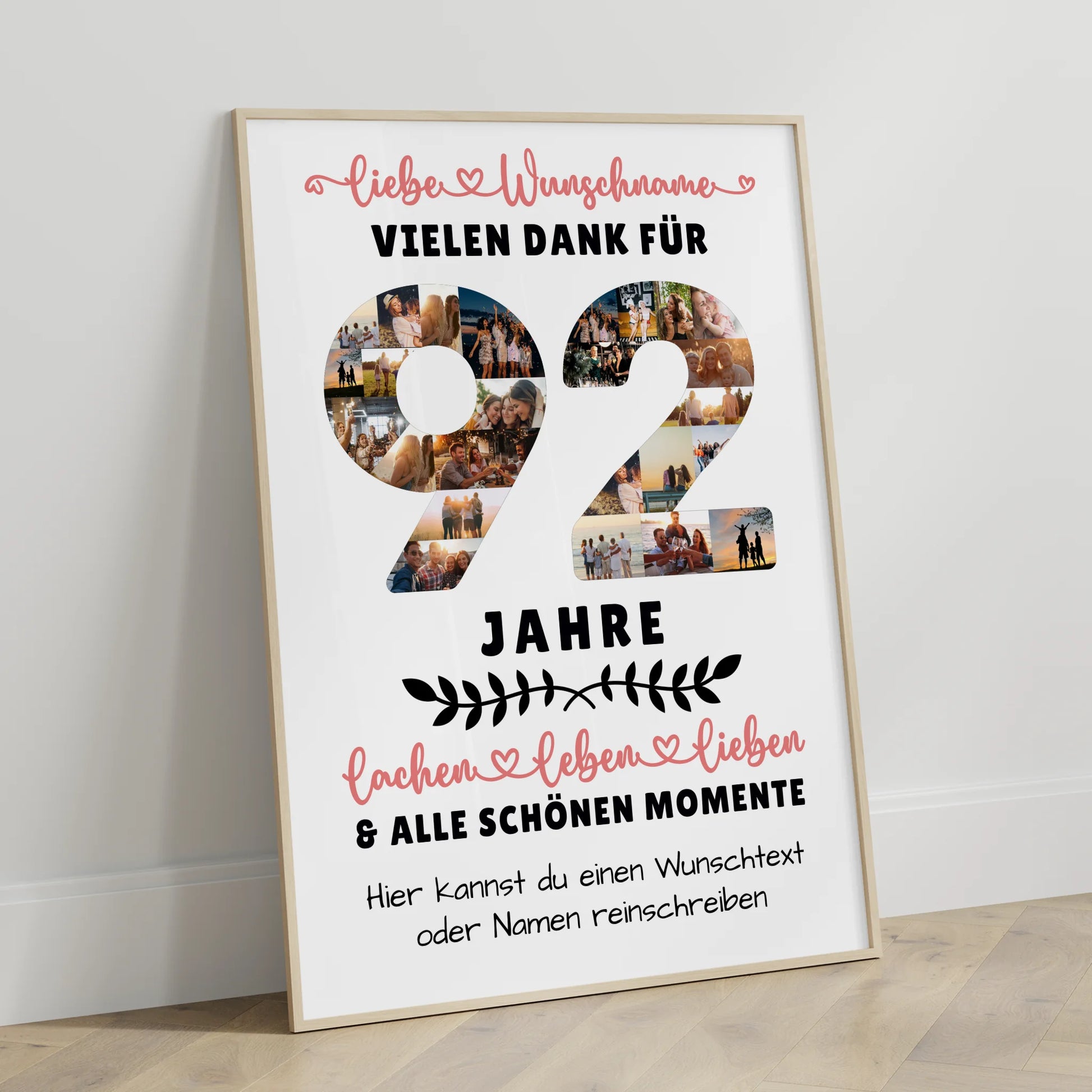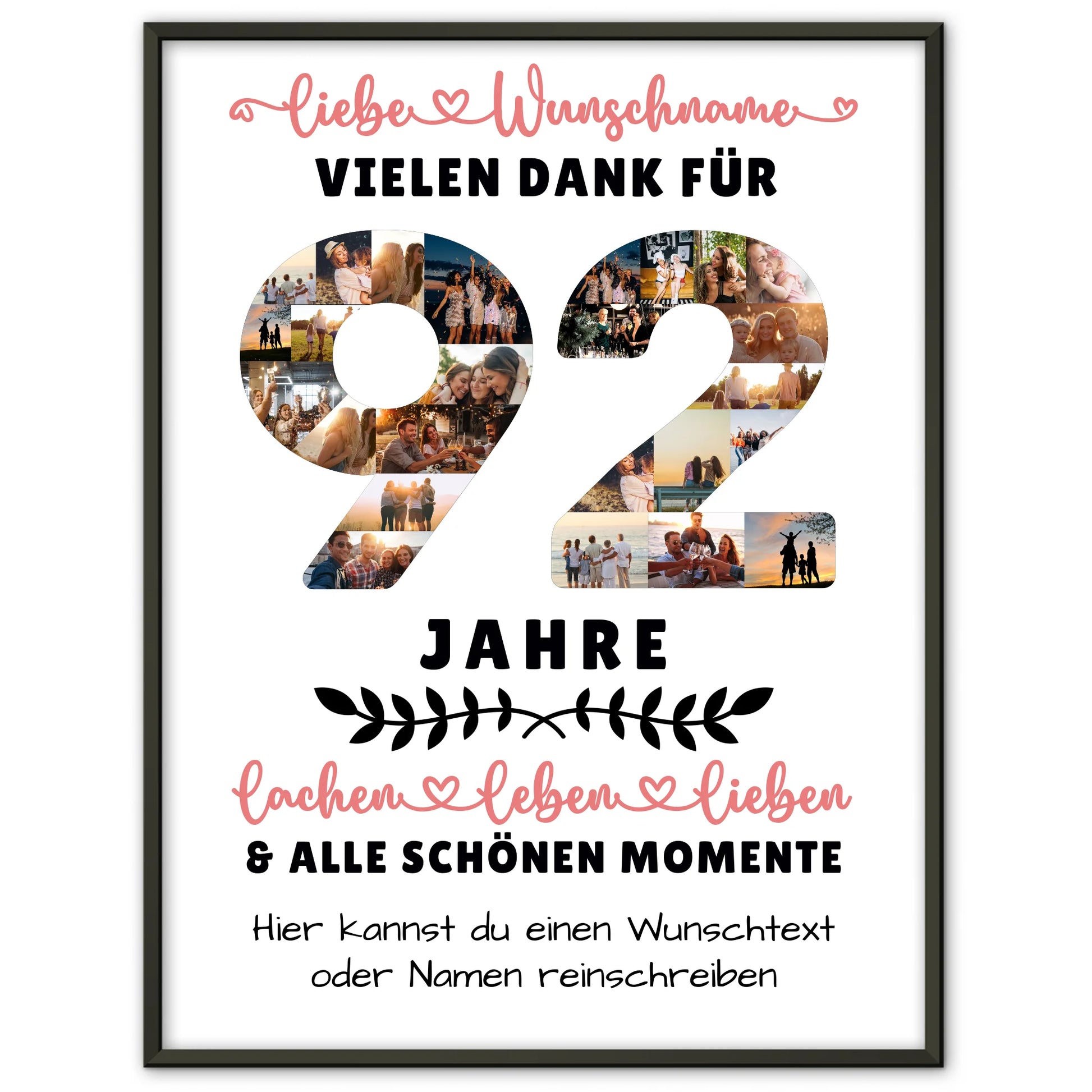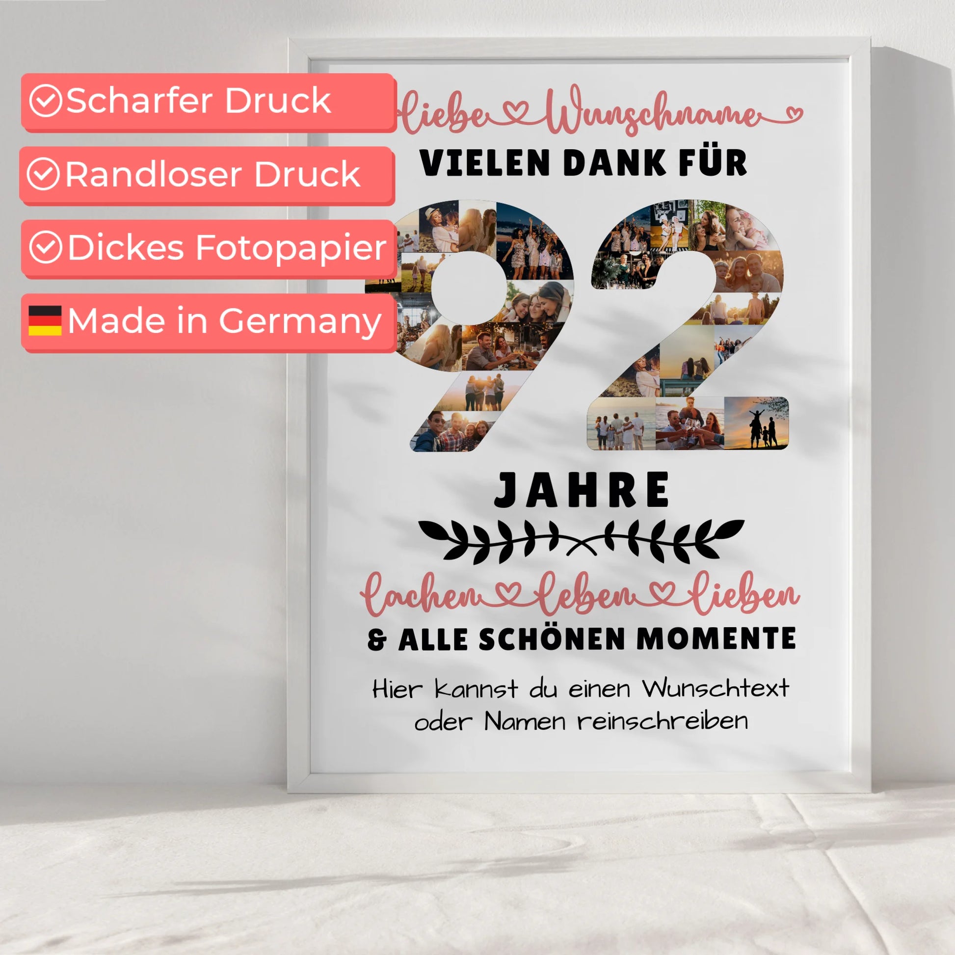 Mache den 92 Geburtstag zu einem unvergesslichen Ereignis mit diesem wundervollen, personalisierten Poster. Bestelle jetzt dein individuelles Geschenk für Oma, Opa, Mama oder Papa!