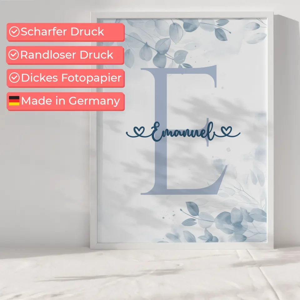 Bestelle noch heute das personalisiert Poster Anfangsbuchstaben Buchstabe E Blau für Jungen und verschenke Freude, die ein Leben lang hält!