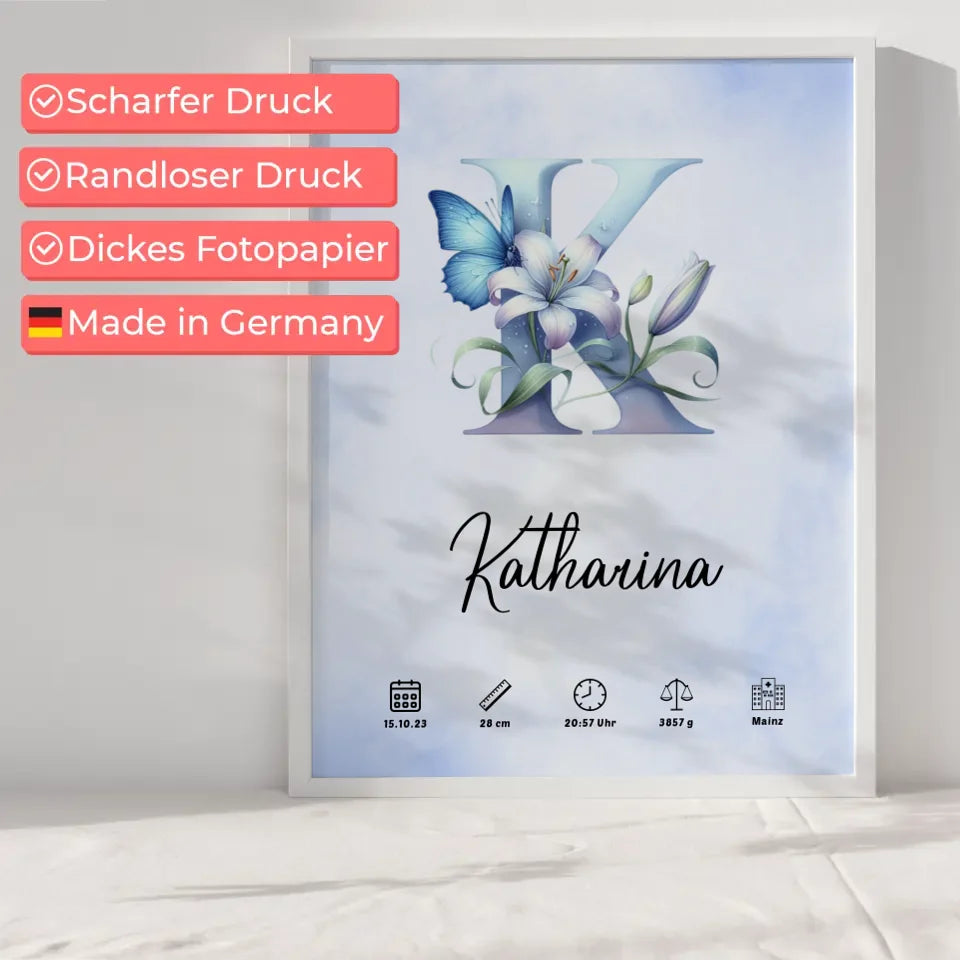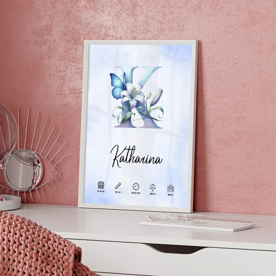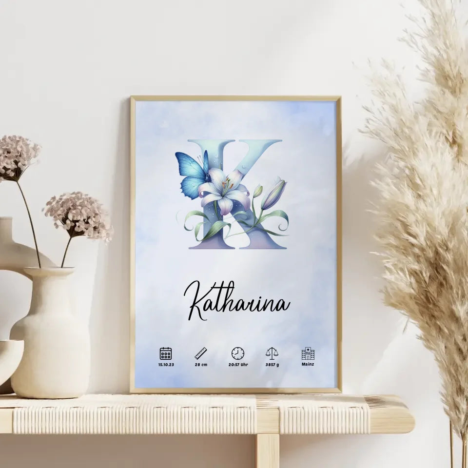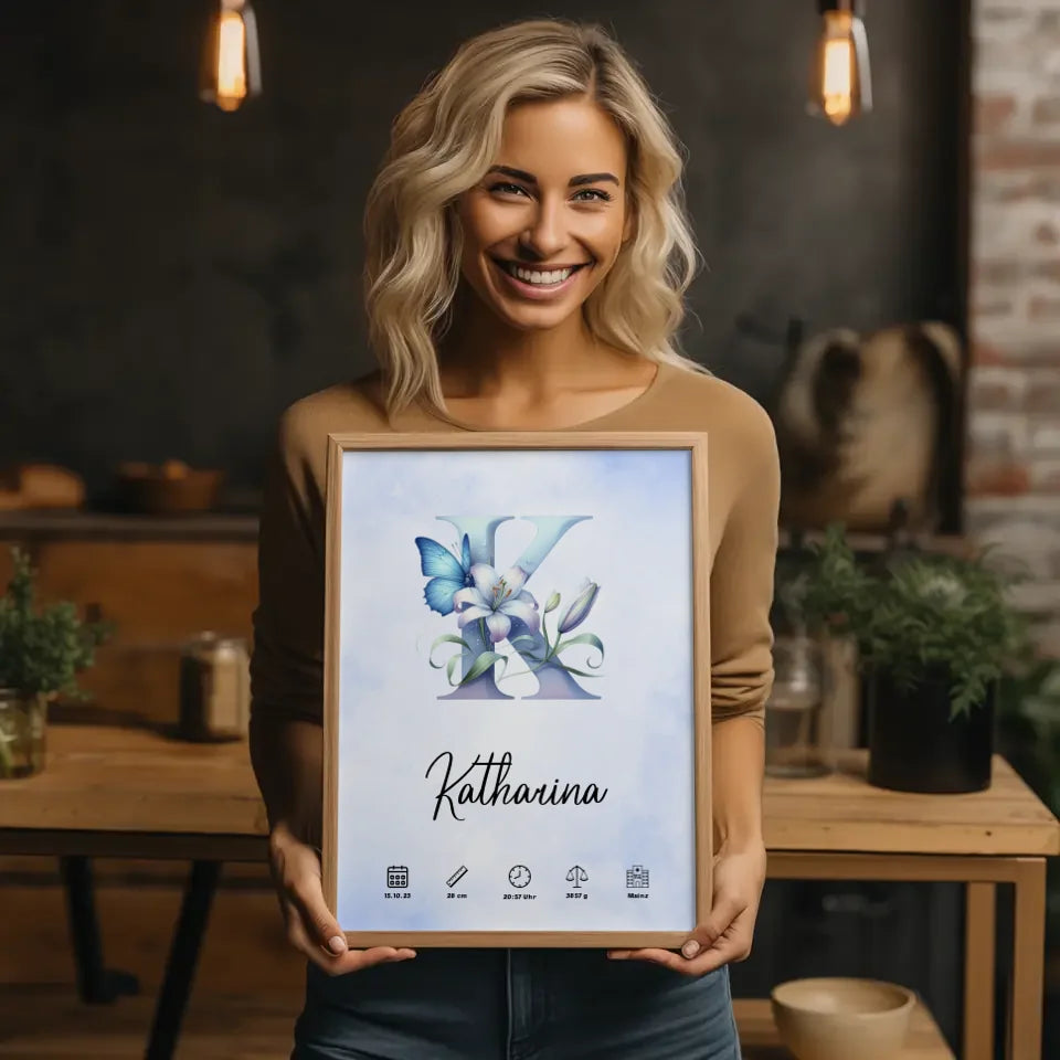 Mache diesen besonderen Moment unvergesslich und wähle unser personalisiertes Poster Buchstaben K Wasserfarben Stil Hellblau Geburt für ein einzigartiges, individuelles Geschenk, das für immer in Erinnerung bleibt.