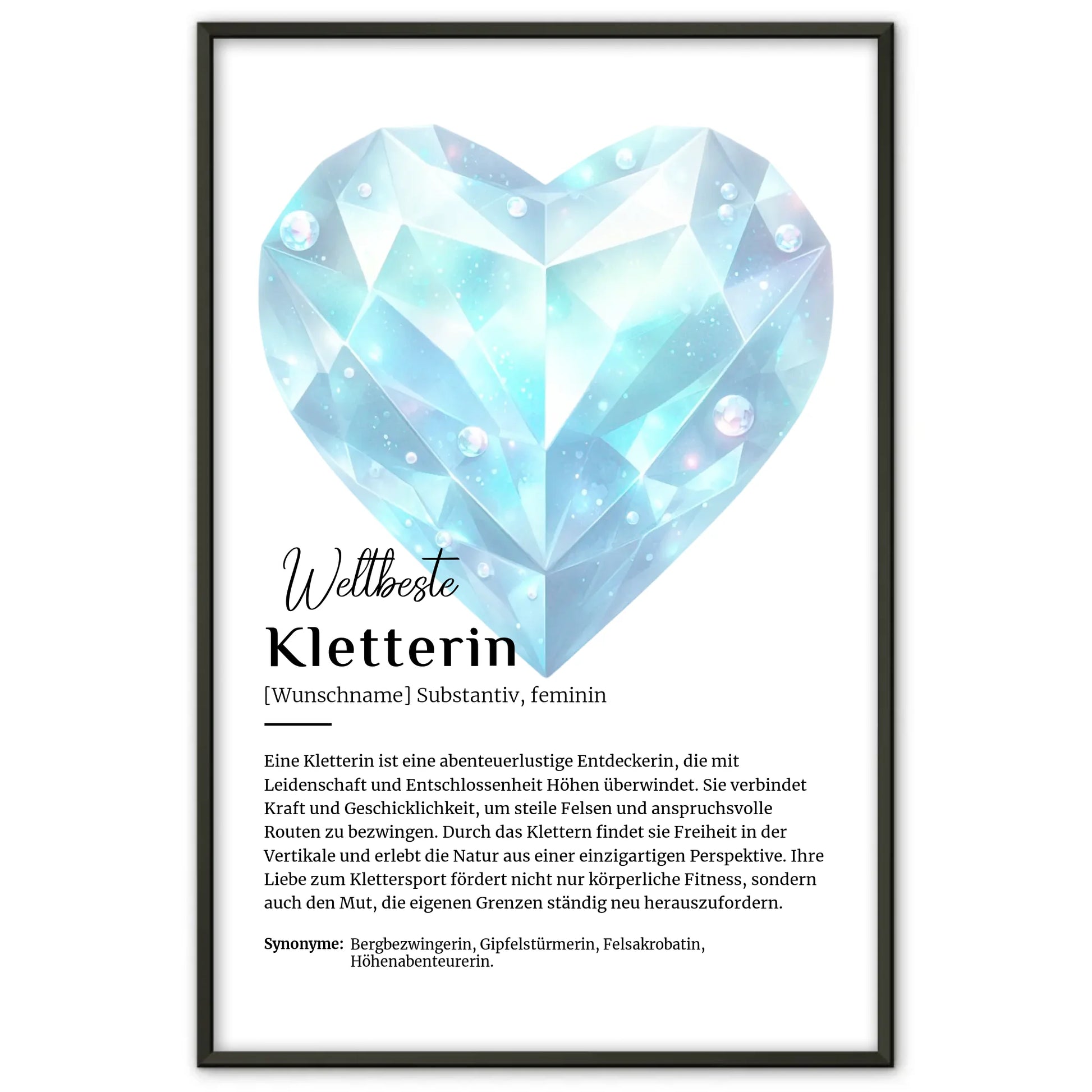 Egal ob im Wohnzimmer, Schlafzimmer oder Büro – dieses personalisierte Poster zieht alle Blicke auf sich und erinnert täglich an die Freude am Klettern. Bestelle jetzt Dein Personalisiertes Poster Definition Kletterin Klettern mit Namen und mache jemandem eine unvergessliche Freude!