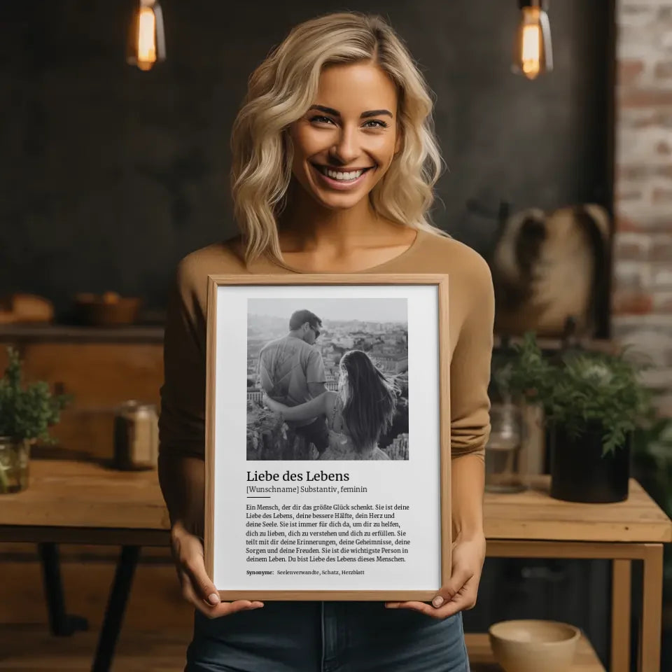 Du suchst ein tolles Geschenk? Dann ist unser Personalisiertes Poster Definition Liebe des Lebens Mit Name und Foto das perfekte personalisierbare Geschenk.