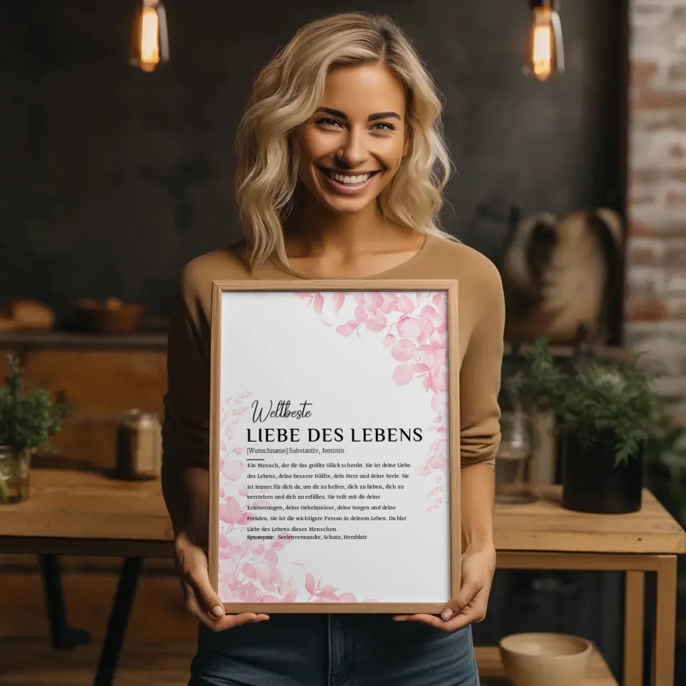 Mache daspersonalisiertes Poster Definition Liebe des Lebens Rosa Floral mit Name zu einem Highlight in deinem Zuhause oder verschenke es an jemanden besonderen. Zeige deine Liebe auf eine kreative und individuelle Weise und lasse das Poster zu einem unvergesslichen Erinnerungsstück werden.