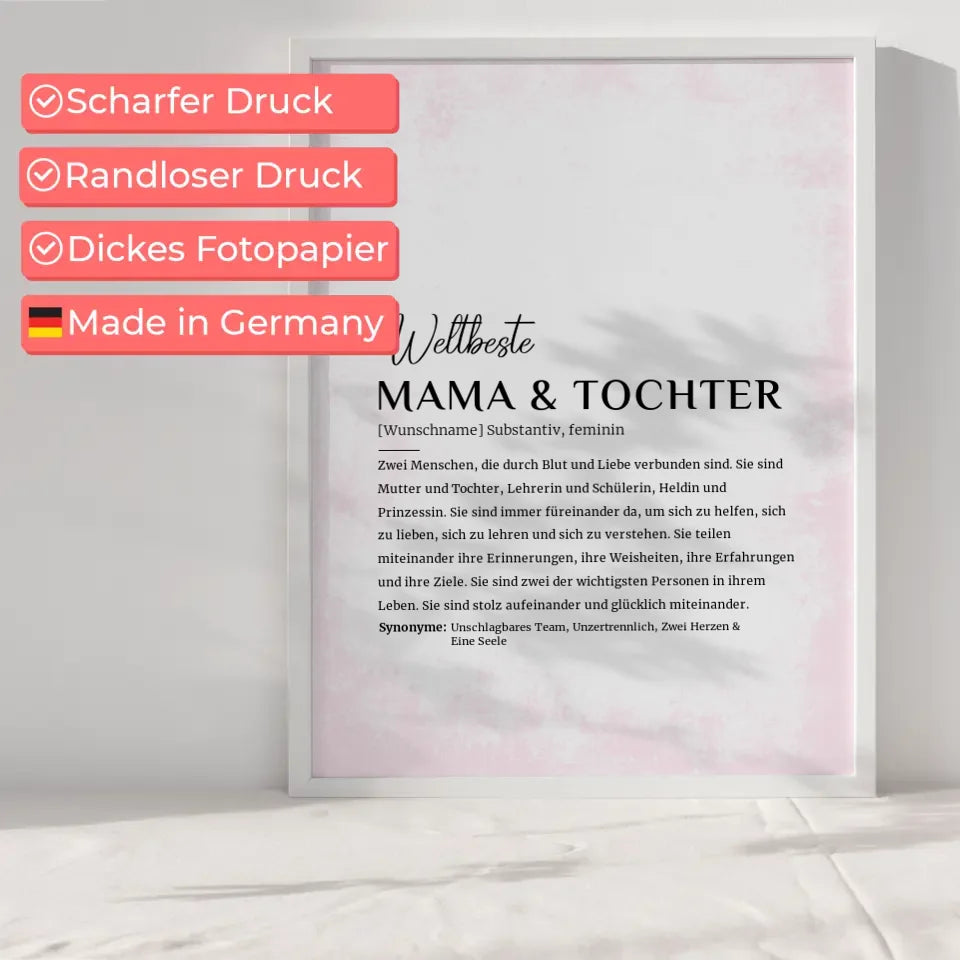Ob zum Geburtstag oder zu Weihnachten, dieses personalisierte Poster ist eine wundervolle Möglichkeit, deine Zuneigung und Wertschätzung auszudrücken. Die harmonische Farbgebung und das ansprechende Design machen es zu einem echten Blickfang in jedem Raum. Überrasche deine Familie mit einem Geschenk, das von Herzen kommt und für immer in Erinnerung bleibt! Das personalisierte Poster Definition Mama & Tochter Rose Vintage mit Name ist nicht nur ein dekoratives Element, sondern ein emotionales Geschenk voller Bedeutung.