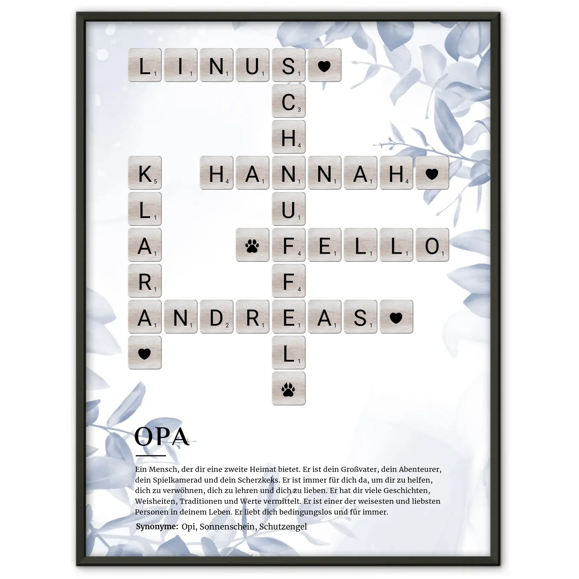 Entdecke das perfekte Geschenk für deinen Opa mit unserem 'Personalisiertes Poster Definition Opa mit Kreuzworträtsel'. Dieses einzigartige und kreative Poster lässt die Herzen von Großvätern höherschlagen. Gestalte das Kreuzworträtsel individuell, indem du die Namen in das Rätsel einfügst und das Hintergrundbild nach deinem Geschmack auswählst. Egal ob zum Geburtstag, zu Weihnachten oder einfach so – unser personalisiertes Poster ist eine großartige Geschenkidee für jeden Anlass.