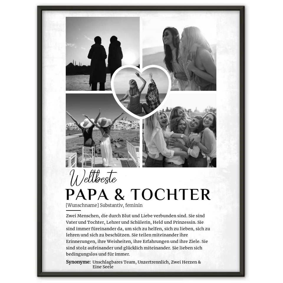 Entdecke unser einzigartiges personalisiertes Poster Definition Papa & Tochter, das speziell für besondere Bindungen zwischen Vätern und Töchtern entworfen wurde. Dieses wunderschöne Kunstwerk kann mit 5 Fotos deiner Wahl, dem Namen deines Vaters sowie einem stilvollen Hintergrundbild in Grau Vintage personalisiert werden. Egal, ob zum Geburtstag, zu Weihnachten oder zum Vatertag – dieses Poster ist das perfekte Geschenk, um deine Wertschätzung auszudrücken.