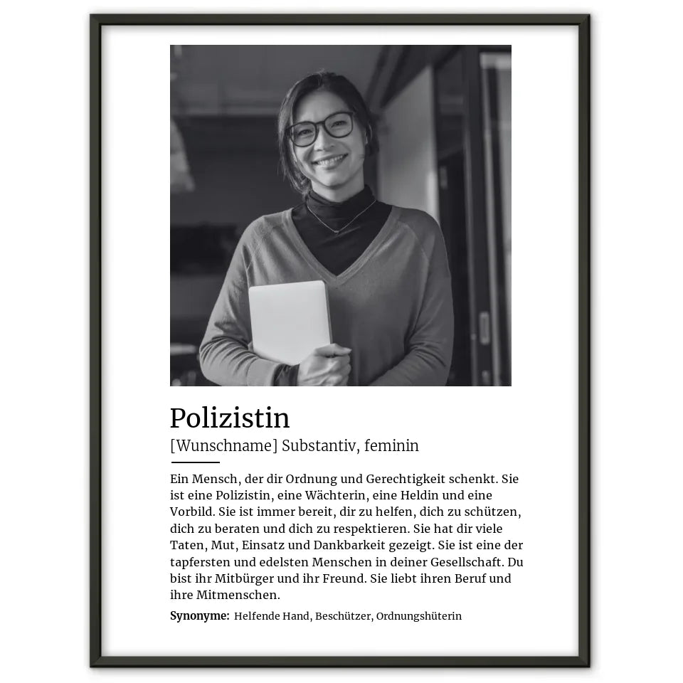 Du bist auf der Suche nach einem schönen tollen Geschenk? Dann ist unser Personalisiertes Poster Definition Polizistin Mit Name und Foto das perfekte personalisierbare Geschenk.