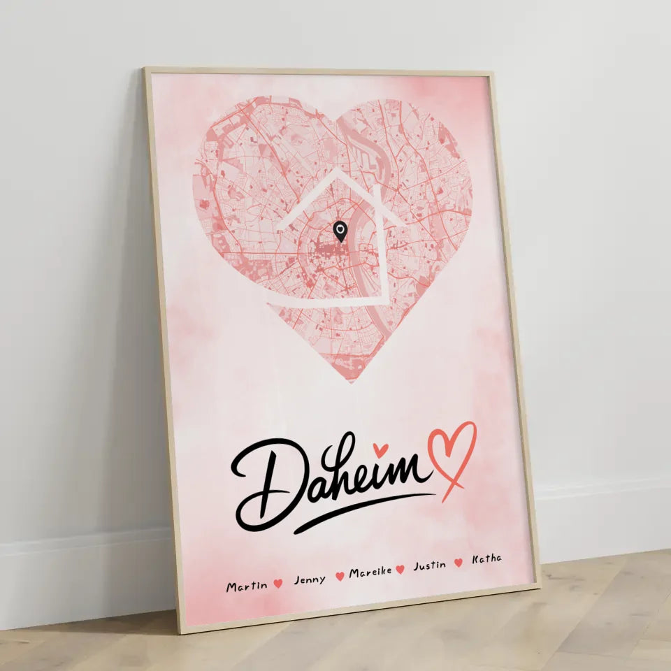 Entdecke das perfekte Geschenk mit unserem personalisierten Poster Familie Stadtkarte Daheim Herz Form mit Nachname
