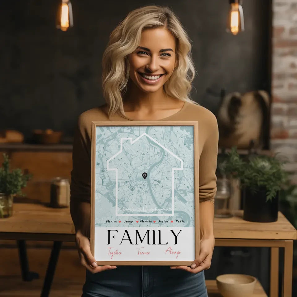Mache Deine Familie zum Zentrum der Freude mit unserem personalisierten Poster Familie! Das Personalisiertes Poster Familie Stadtkarte Family Together mit Nachname präsentiert nicht nur eine wunderschöne Stadtkarte eines besonderen Ortes, sondern ist auch mit dem herzlichen Spruch 'We are family' versehen. Gestalte dieses einzigartige Kunstwerk ganz nach Deinen Vorstellungen, indem Du den Namen Deiner Familie und einen individuell änderbaren Spruch hinzufügst. Dieses Poster ist das ideale Geschenk für zahlreiche Anlässe, ob zum Geburtstag, zu Weihnachten, zu Ostern, zum Muttertag oder zum Vatertag. Lass Deine Lieben wissen, wie viel sie Dir bedeuten, und überrasche sie mit einem persönlichen Geschenk, das von Herzen kommt. Verschenke unvergessliche Momente mit unserem Poster Familie, das nicht nur dekorativ ist, sondern auch eine tiefere Bedeutung hat. Jedes Mal, wenn Du das Stadtkarte Poster siehst, wirst Du an die wertvollen Erinnerungen und Momente mit Deinen Liebsten erinnert. Entscheide Dich jetzt für das Family Together Poster und individualisiere es mit dem Nachnamen Deiner Familie!