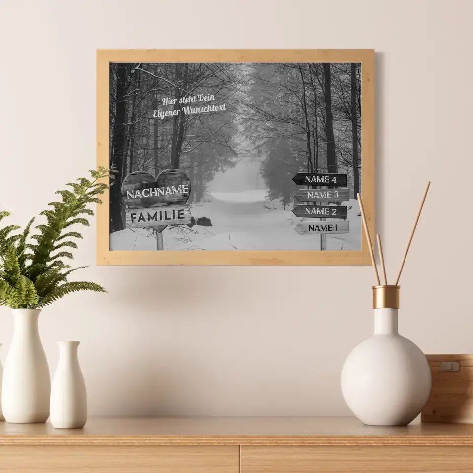 Unser Personalisiertes Poster Familie Wegweiser Winter Allee Schwarz Weiß & Familienspruch