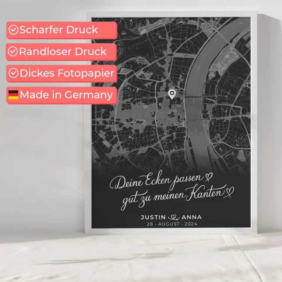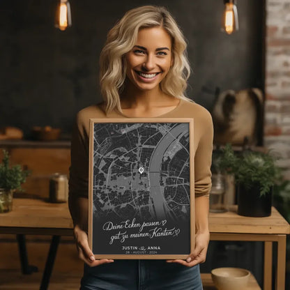 Entdecke das personalisierte Poster für Paare – Dunkelgrau Stadtkarte Deine Ecken