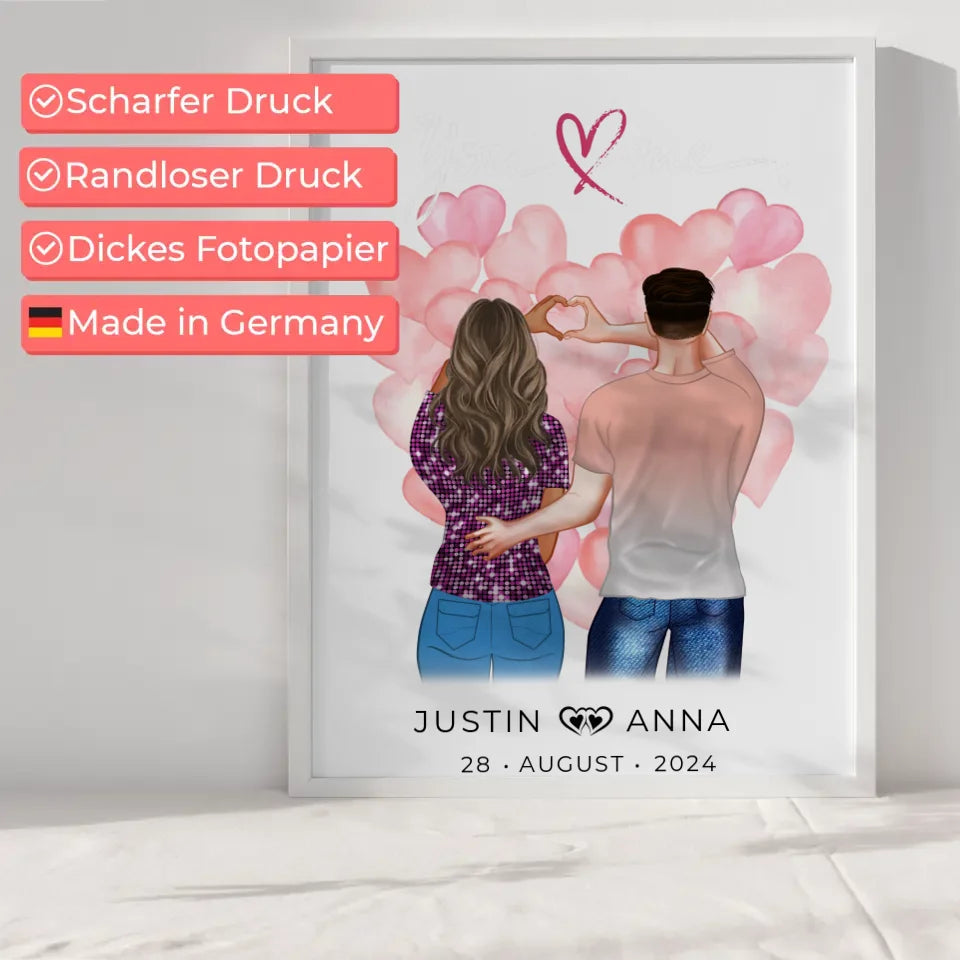 Suchst du nach einem einzigartigen Geschenk, das die Liebe zwischen dir und deinem Partner perfekt widerspiegelt? Dann ist unser personalisiertes Poster für Paare Figuren You & Me mit Namen Verliebte genau das Richtige für dich! Dieses besondere Poster lässt sich individuell gestalten – wähle aus 2 Cliparts für Paare, füge eure Namen und das wichtige Datum hinzu und wähle ein passendes Hintergrundbild aus. Zusätzlich kannst du einen eigenen Spruch oder Wunschtext einfügen, der eure Beziehung auf ganz besondere Weise zum Ausdruck bringt.